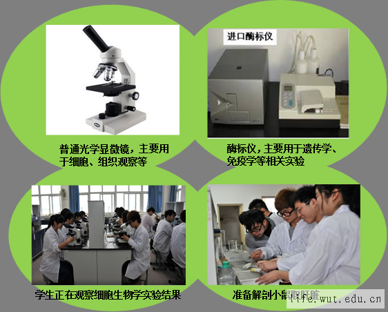 本实验室配套的主要设备包括普通光学显微镜、离心机、细胞培养箱、酶标仪等。主要承担细胞生物学、植物细胞工程、普通遗传学、免疫学等课程的实验教学与科研工作。