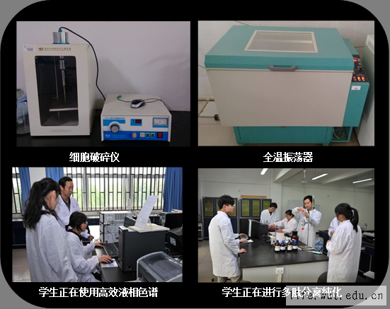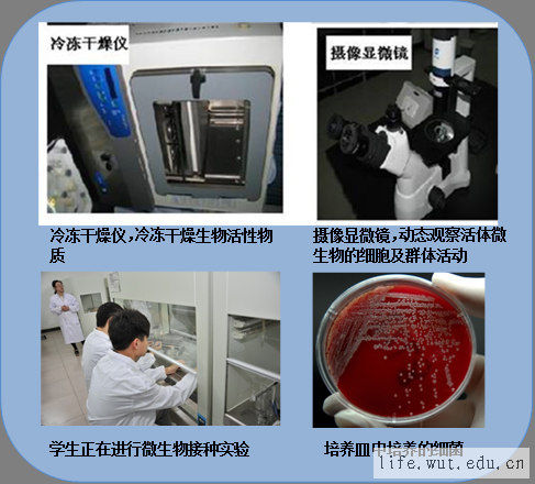 本实验室配套的主要设备包括超净工作台,恒温摇床,制冷摇床,自动台式灭菌器,生化培养箱,恒温培养箱,冰箱,真空干燥箱,恒温干燥箱,显微镜以及大量的微生物装片等。本实验室的主要任务是进行微生物学及相关的课程的实践性教学,包括微生物学、微生物发酵工程等,能够为学生开设教学大纲规定的这些微生物学及相关课程的实践性教学任务。该实验室同时还可接纳学生的毕业论文工作以及教师的科研工作。