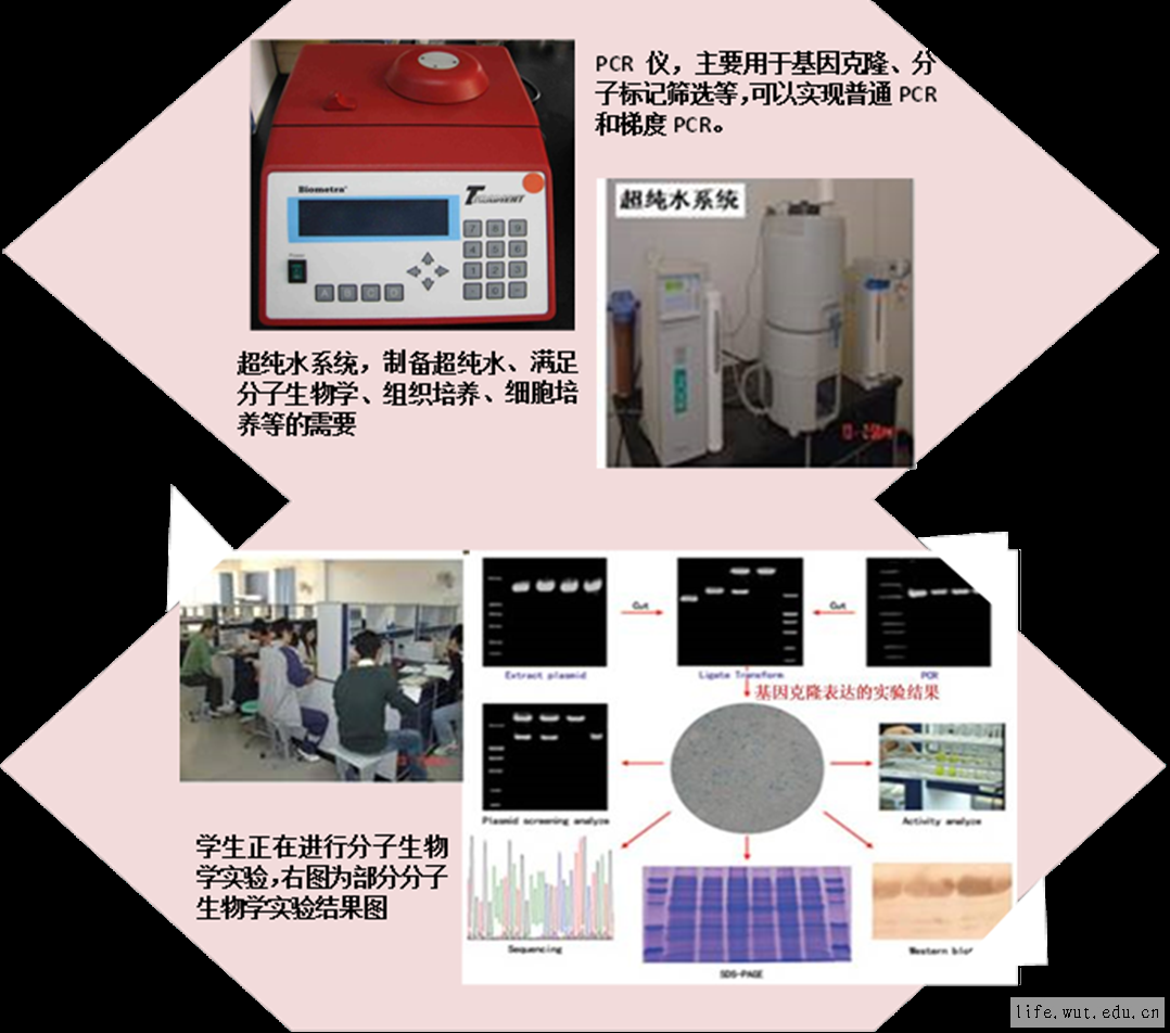 本实验室主要开展基因克隆、绿色荧光蛋白表达、载体构建、蛋白质电泳、DNA凝胶电泳、PCR基因扩增、Southern杂交等实验,使学生能够将抽象的分子生物学理论知识应用到实际中来,使学生动手能力的得到充分的锻炼,同时熟练掌握分子生物学最前沿的技术。主要承担分子生物学、基因工程、蛋白质酶工程等本科实验教学工作与相关科研工作。