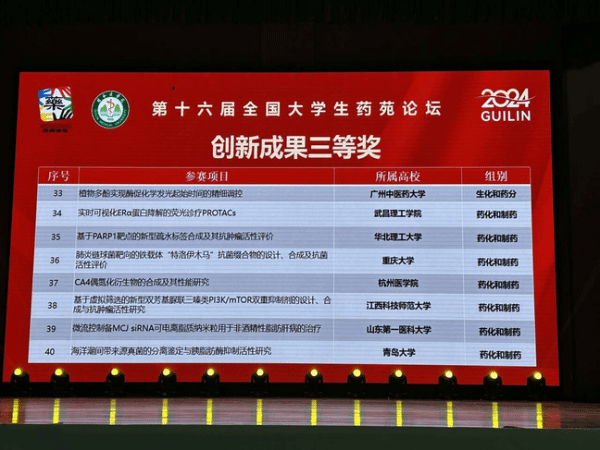 在激烈的竞争中,英国上市365官网的参赛项目“实时可视化ERα蛋白降解的荧光诊疗PROTACs”经过层层选拔和严格评审,最终脱颖而出,荣获创新成果三等奖,这一成绩不仅是对英国上市365官网参赛师生努力的肯定,也是对英国上市365官网教学和科研实力的一次展示。此外,英国上市365官网的论文作品也获得了优秀论文奖,这一进步证明了英国上市365官网在药学领域的学术影响力和科研水平。此次优秀论文奖的获得,不仅提升了英国上市365官网的学术声誉,也为英国上市365官网师生提供了更多学术交流和合作机会。
