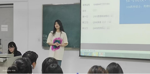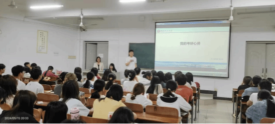在分享环节,六位同学依次分享了他们的考研经验。刘易同学以初试、复试第一的总成绩上岸心仪学府,她分别从不同角度分享了自己的备考经历,包括如何制定高效的学习计划、怎样选择适合的复习资料、各科复习技巧以及应对压力和挫折的方法等。