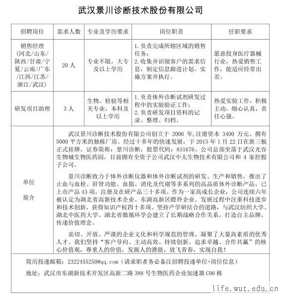武汉景川诊断技术股份有限公司招聘简章
