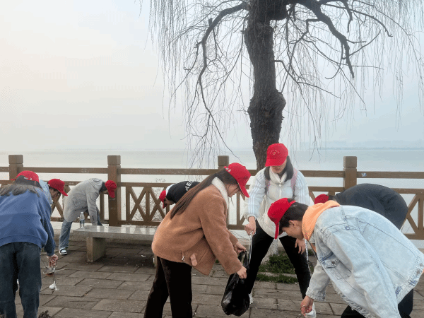 志愿者们沿着汤逊湖开展陆域卫生清理,对汤逊湖沿岸出现的塑料袋、塑料瓶、废布等垃圾,一一捡拾清理。