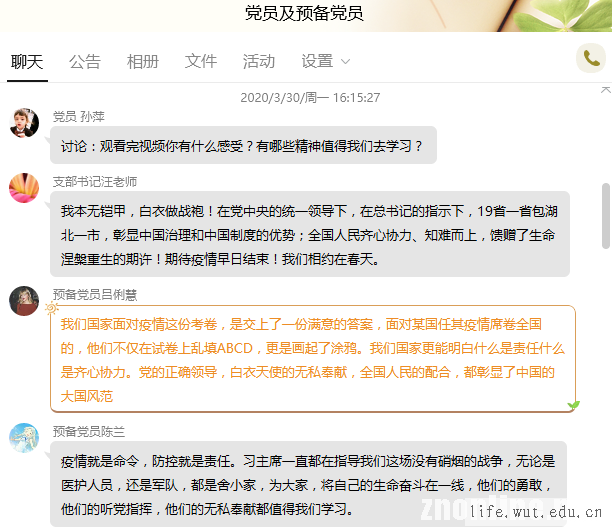 会议开始后,由党支部宣传委员邹欢同志诵读《中国共产党章程》,巩固支部各党员及预备党员的理论积累。随后,各位同志观看视频“总书记指挥这场人民战争——白衣执甲”并讨论分享自己的观后感想。观看完视频后汪书记动情地分享道:“我本无铠甲,白衣做战袍!期待疫情早日结束,我们相约在春天!”党员唐义同志也为党中央在此次疫情防控工作的发挥的巨大作用表达自己的感受,他说:“看完视频,很是震撼,在此次疫情防控中,我们看到了勇敢无谓的白衣战士,听到了众多优秀党员的模范事迹,但就是这些伟大的事例,让我忽略了党中央在其中发挥的重要领导作用,能有现在突出的抗疫表现,就是源于党的领导,看到视频的时候,我真的很为自己是一名党员感到由衷的自豪与骄傲!”