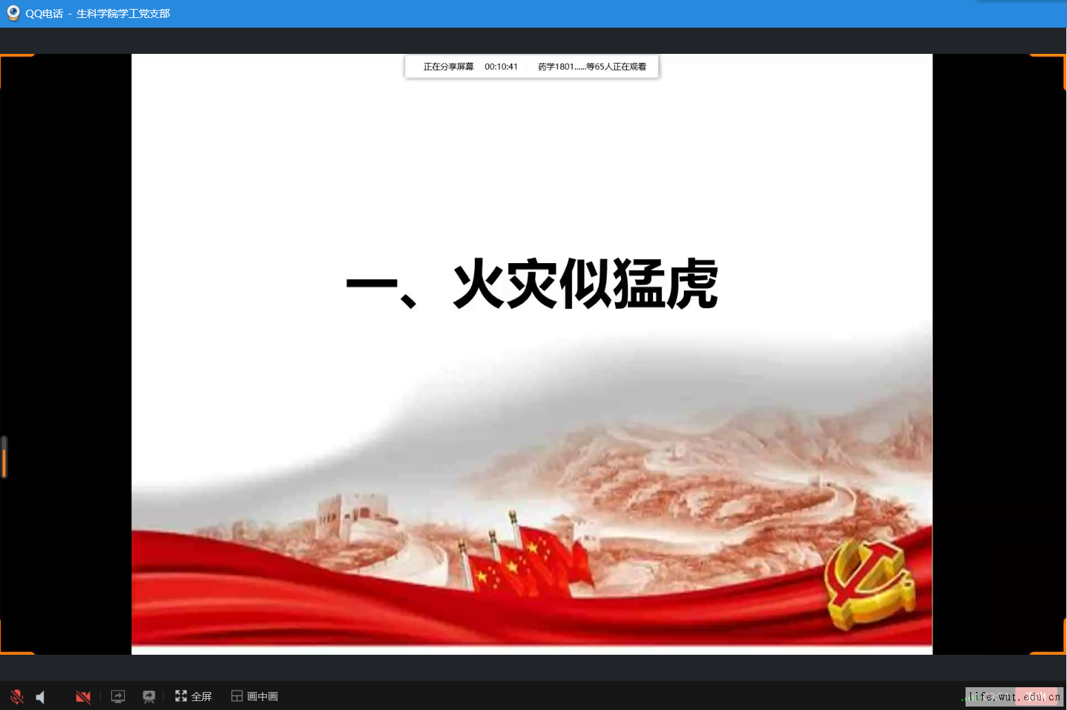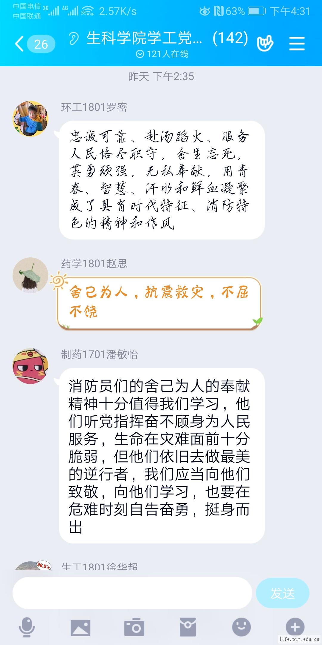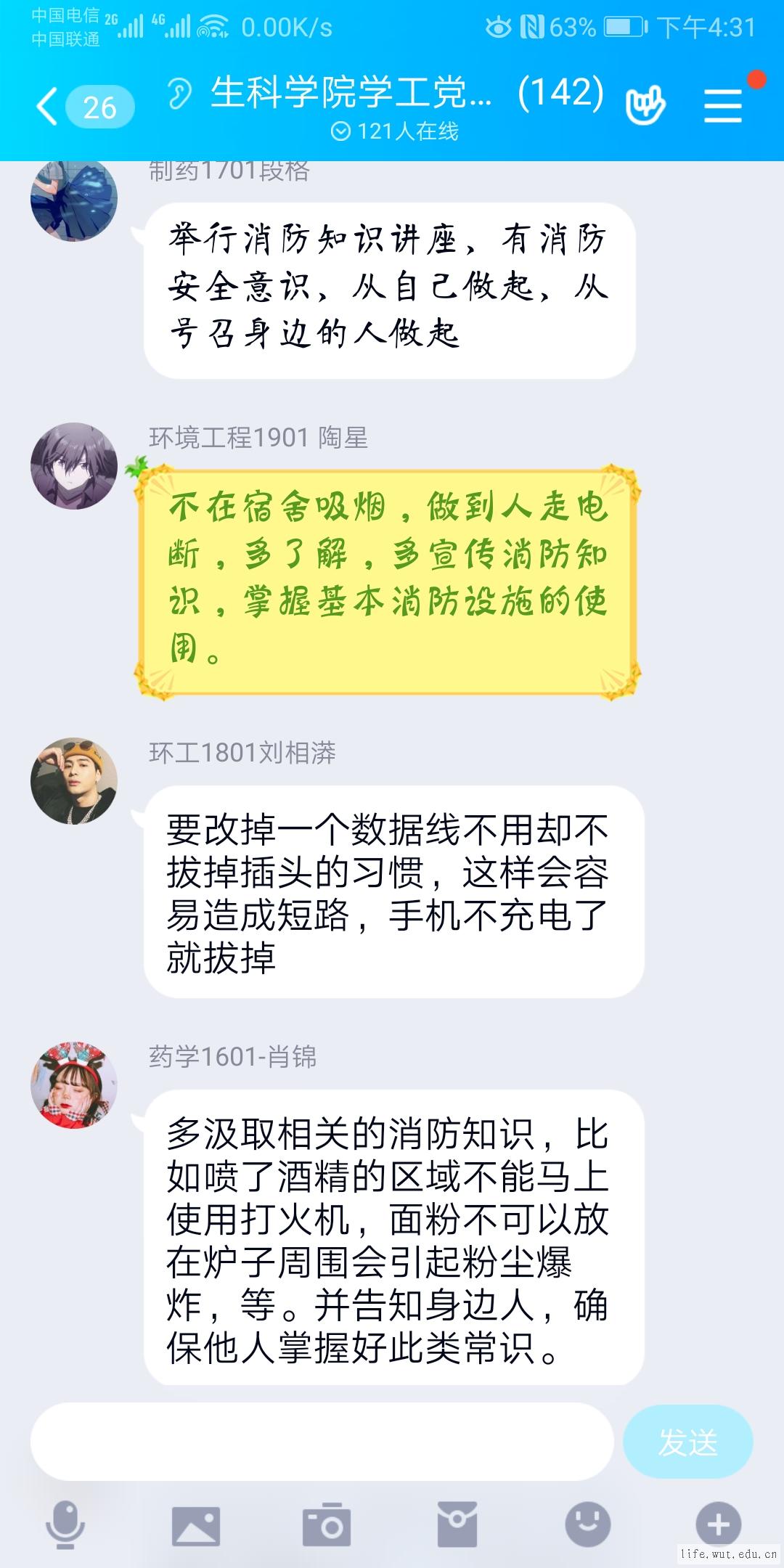 在观看视频后,主持人提出“作为新时代的青年,你还能想到哪些消防精神是值得我们学习和发扬的吗?”药学1801魏磊同志回答:“我也是一个四川人,通过前几天以及去年的凉山火灾,我也深感惋惜,消防员们的忠诚可靠、赴汤蹈火、服务人民的消防精神也让我很钦佩,明知山有火,偏向火山行,他们付出了青春,汗水,鲜血甚至生命,我们要像他们一样,勇敢前行!”。在主持人何文昕同志通过PPT展示了防火小科普和面临火灾时的逃生技巧以后,她提出“作为党支部的一员,我们可以起到什么带头作用呢?”的问题,药学1801李文秀同志回答:“在刚过去的清明节,有许多人延续古老的祭扫方法,在墓前开展烧纸之类的活动,很容易引起火灾。同志们可以和家里人商量清明节时用网上祭扫的方法,既可以表达哀思,又可以避免火灾。”