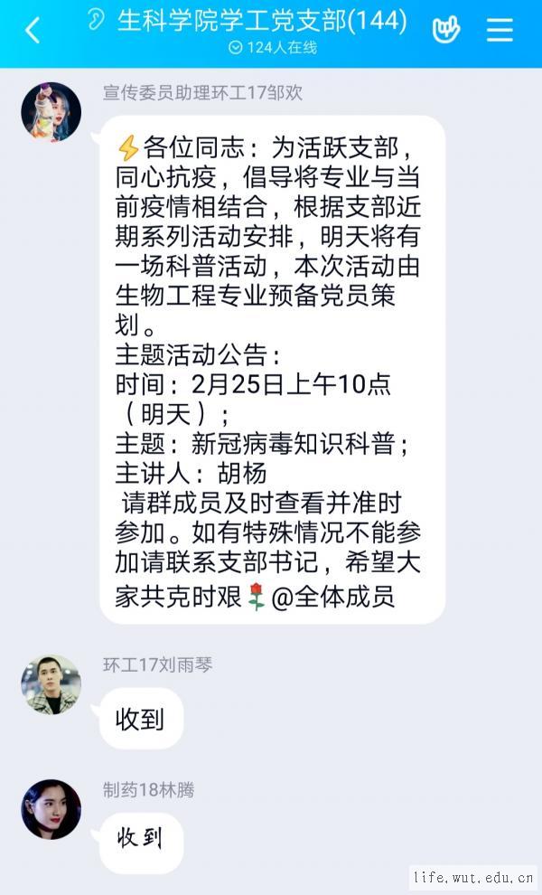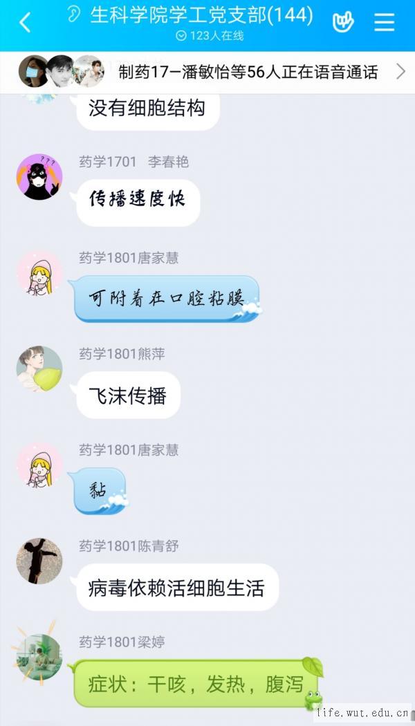 据了解,此活动是生物工程1601班袁明亮,生物工程1701班陈兰、胡杨三人合力完成,他们在准备的过程中搜集了很多专业知识,通过自己对专业知识的学习以通俗易懂的方式向同志们进行科普,启发同志们用专业知识去解释新冠病毒的起源,传播途径,达到不传谣不信谣的目的。谈及组织开展此次活动的初衷时胡杨同志如此说道:“生物工程系老师非常注重启发式教学,日常授课绝不会单纯拘泥于课本的讲授,老师们常常鼓励我们独立发现问题、分析问题、解决问题。医护人员在前线与病毒斗争,我没有看护病人的专业知识,但我可以集合专业向大家科普相关病毒防治的注意事项,我希望通过这次活动加深大家对此次疫情相关专业知识的认识。”