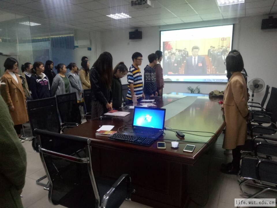 当日上午8点50分,与会人员准时到达该院405教室。九时,随着国歌的响起,会议拉开序幕,与会人员全体起立,为已故老一辈无产阶级革命家和革命先烈默哀,而后中国共产党中央委员会总书记、中华人民共和国主席习近平讲话,他先介绍了我国五年来的变化,讲述了党的进步与一些不足,他说:“全党全国各族人民要紧密团结在党中央周围,高举中国特色社会主义伟大旗帜,锐意进取,埋头苦干,为实现推进现代化建设、完成祖国统一、维护世界和平与促进共同发展三大历史任务,为决胜全面建成小康社会、夺取新时代中国特色社会主义伟大胜利、实现中华民族伟大复兴的中国梦、实现人民对美好生活的向往继续奋斗!”台下的代表与屏幕外的同学们热烈鼓掌。习近平强调:"实践没有止境,理论创新也没有止境。世界每时每刻都在发生变化,中国也每时每刻都在发生变化,我们必须在理论上跟上时代,不断认识规律,不断推进理论创新、实践创新、制度创新、文化创新以及其他各方面创新。"