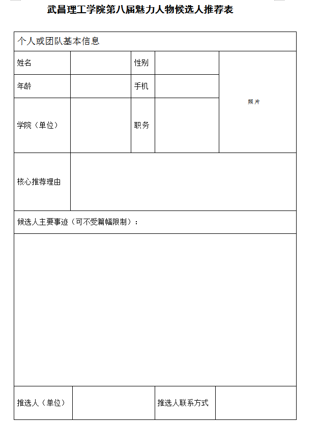推荐表可直接到学校网站下载,电子申请表填好后请直接发送到xcb@wut.edu.cn。推荐阶段时间截止到5月10日,6月初召开表彰大会进行表彰。望大家积极参与,推出先进典型,营造创优争先的校园文化氛围,把“魅力人物评选活动”切实办成我校的文化品牌和文化名片。
