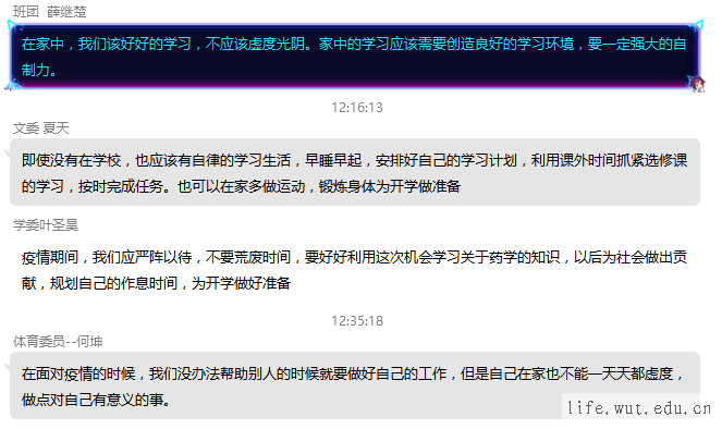 疫情期间,学生的自主学习尤为重要。会上同学们都积极分享了各自在家的学习情况,药学1901班的覃红说,“疫情期间除了按时上课之外,我还会每天坚持背英语单词,听英语新闻,提高自己的英语水平。”素质导师邓婧号召大家,要利用这个“加长版”假期,查缺补漏、及时充电,规划人生、思考未来,为个人成长打下坚实基础。