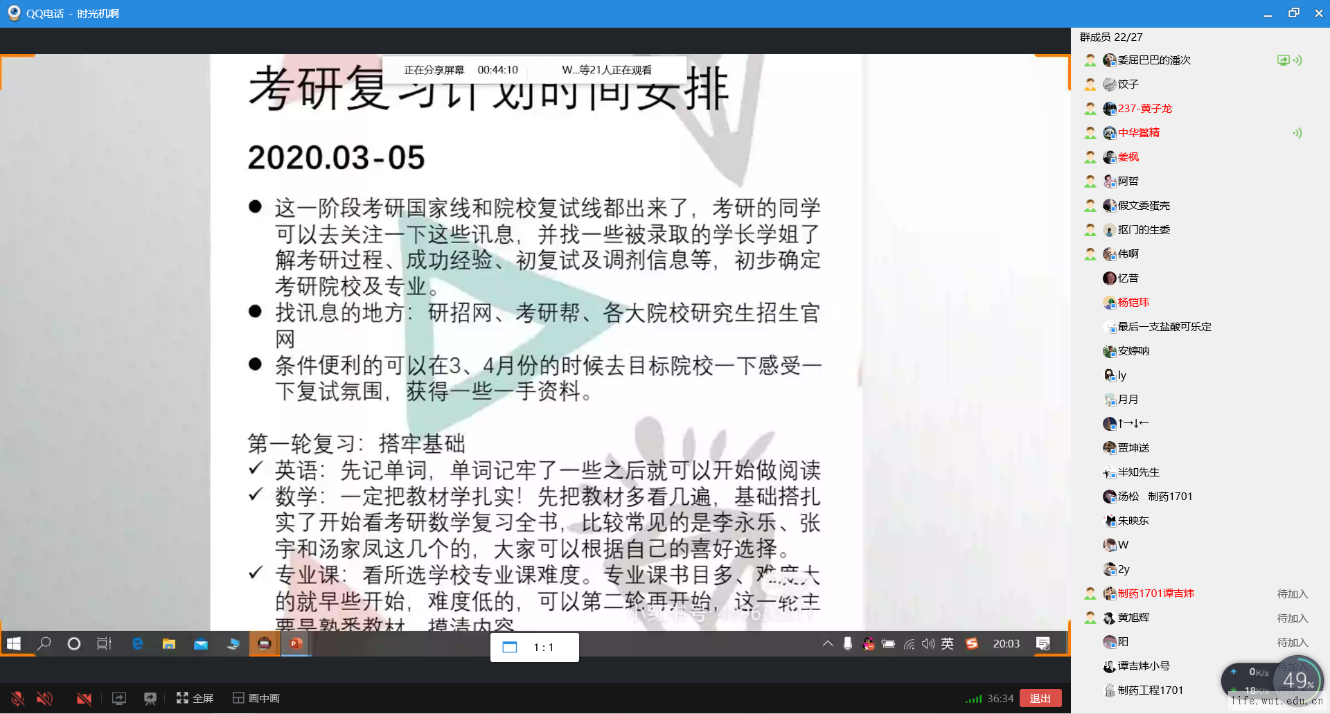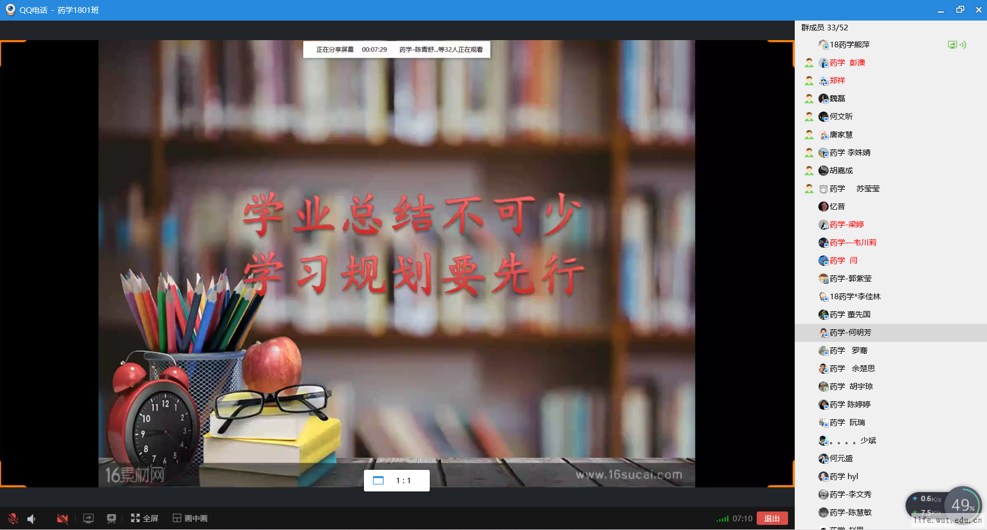 “每天早睡,按时起床”“制定计划,将手机变成对学习有利的工具”“考研的同学可以先复习英语、专业课再是政治”“没带课本的同学,可以下载电子书”“课前做好预习,课后做好笔记和复习”关于疫情期间线上学习的方法和感受,同学们纷纷发表了自己的观点。在此次主题班会中,制药工程1701班主讲人潘敏怡同学总结了上学期的班级期末考试情况,提出同学们要重视选修课,大家可以相互分享学习选修课的方法。关于返校后的学习,潘敏怡同学说道:“返校后学习强度较大,对于考研考公的同学,复习时间将被压缩,同学们一定要做好学习规划,充分利用时间。”此外,制药工程1701班团支书唐义还向同学们分享了考研复习计划时间安排,同学们也在班级QQ群里分享了考研复习资料。药学1801班主讲人熊萍提出倡议,同学们要养成科学学习习惯,合理安排学习时间,营造学习气氛,提高学习效率。