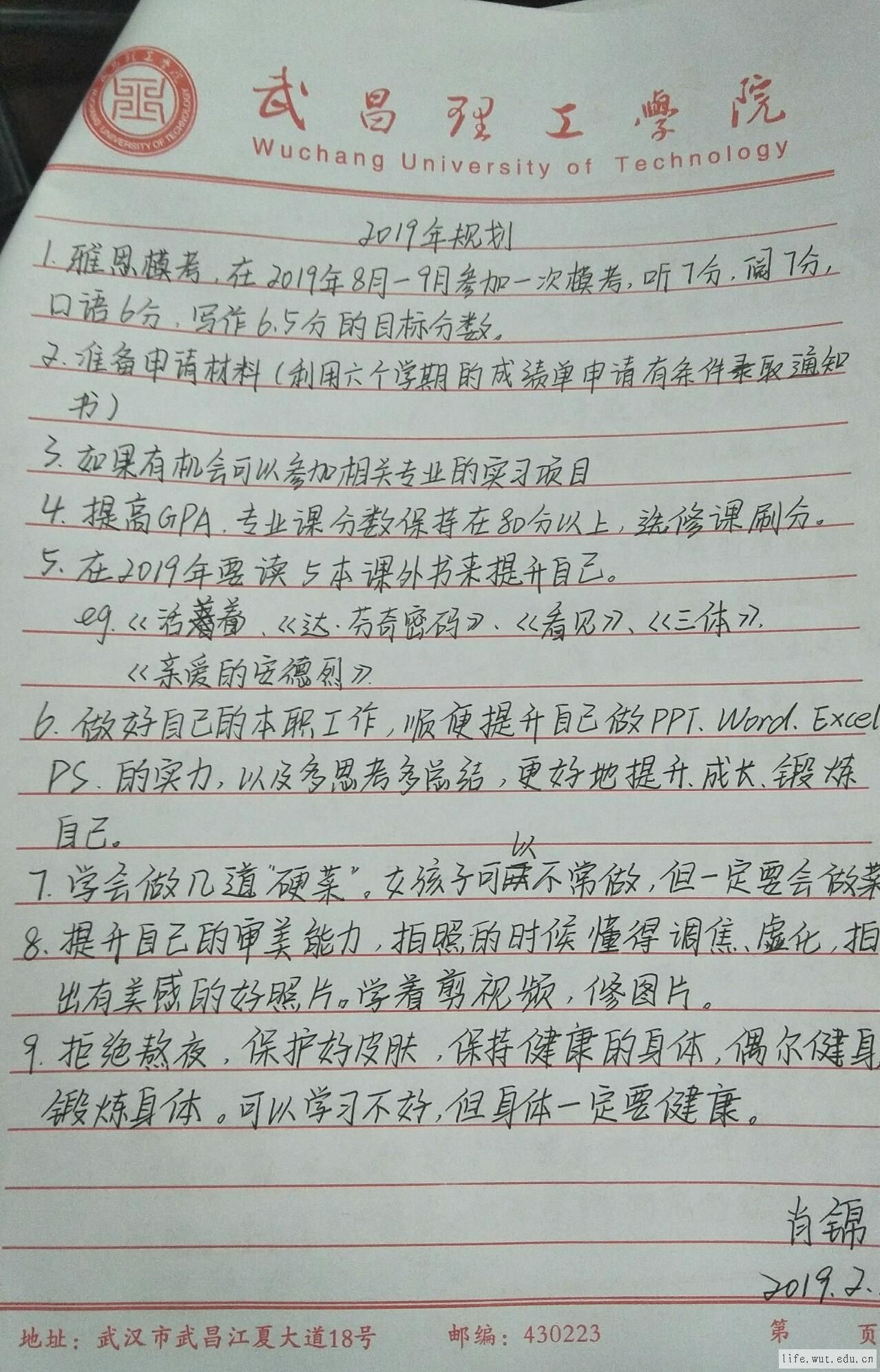“什么都不做,便什么都做不了,一切都从改变自己开始。”制药工程学生付子豪在总结中这样写道。最开始,付子豪同学对专业知识和英语都是极为排斥的,但在2018年他按着计划静下心来学习,发现英语也不像想象中那么难以接受,并且他在规划中明确表示英语四级定会通过。药学1601班肖锦同学的2019年规划书给素导留下深刻印象,肖锦同学最初就坚定了出国留学的信念,她的计划中具体到每月每天该做什么,该为什么而努力,在为出国留学做准备的同时,她也计划到2019年至少要读5本书来充实自己,要学习摄影技术,提高审美能力等。看着同学们如此用心书写的计划书,鲁素导表示很满意。