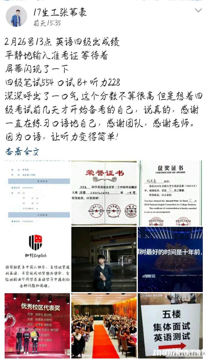 成绩公布后,张苇豪同学分享道:“对于英语四级考试,我觉得,首先是心态上,我们要端正自己学习英语的态度,英语基础没有那么好的人应该把它当做一次挑战,在备考过程中全力以赴,而不是靠考试的运气和转发锦鲤,成功者不是赢在比赛场上而是赢在训练场上。其次,多给自己创造英文学习环境,比如说,多听一些英语VOA,BBC,多开口说英语,让自己脑海里有英文的潜意识,这样对听力超级有帮助。平时没事的时候多看一些英文文章,既可以了解社会热点,又可以锻炼英语阅读速度积累单词。”(完)
