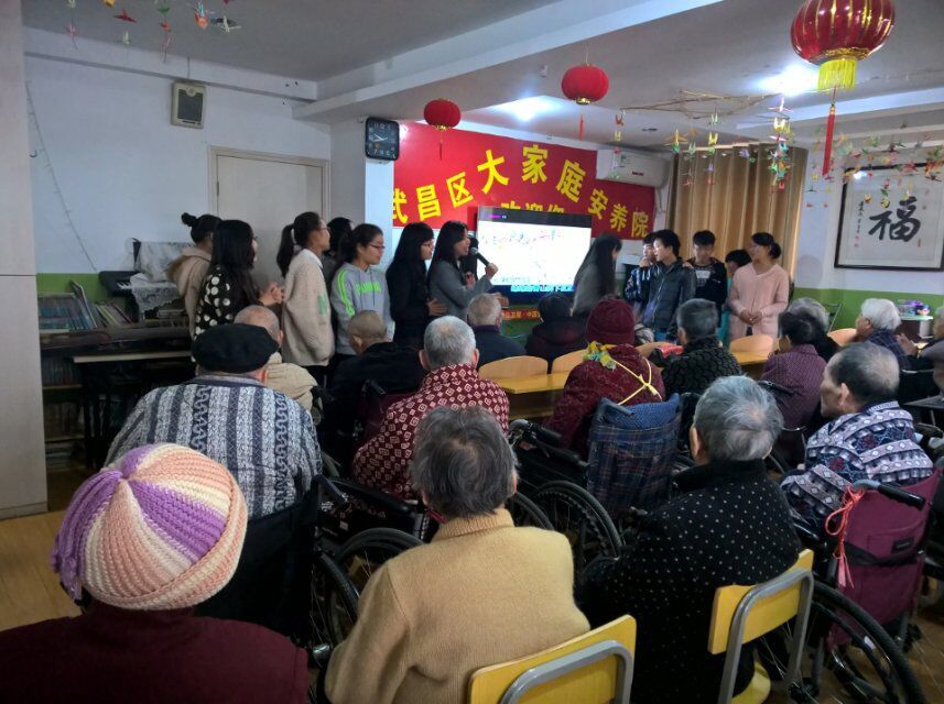 活动分为几个部分,首先是17名志愿者合唱了一首《朋友》,献给爷爷奶奶们,其中一位还为老人们表演了一段民族舞蹈。接着志愿者们邀请台下的李爷爷,合唱一首《夫妻双双把家还》。台下的李奶奶更是主动献唱,清唱了一首《鞋儿破帽儿破》;台下的老人们说一位赵奶奶会弹电子琴,在大家的盛情邀请下,赵奶奶一口气弹了《五星红旗》、《茉莉花》、《小白杨》、《老年的朋友来相会》等五首曲目,台下的大学生和老人们也都看着歌词本热情高昂的唱着;唱完之后,大学生志愿者和湖北日报“特别关注”一起给老人送杂志和水神牌的消毒液,并为他们讲解杂志的内容,教他们正确使用以及使用时应注意哪些方面.