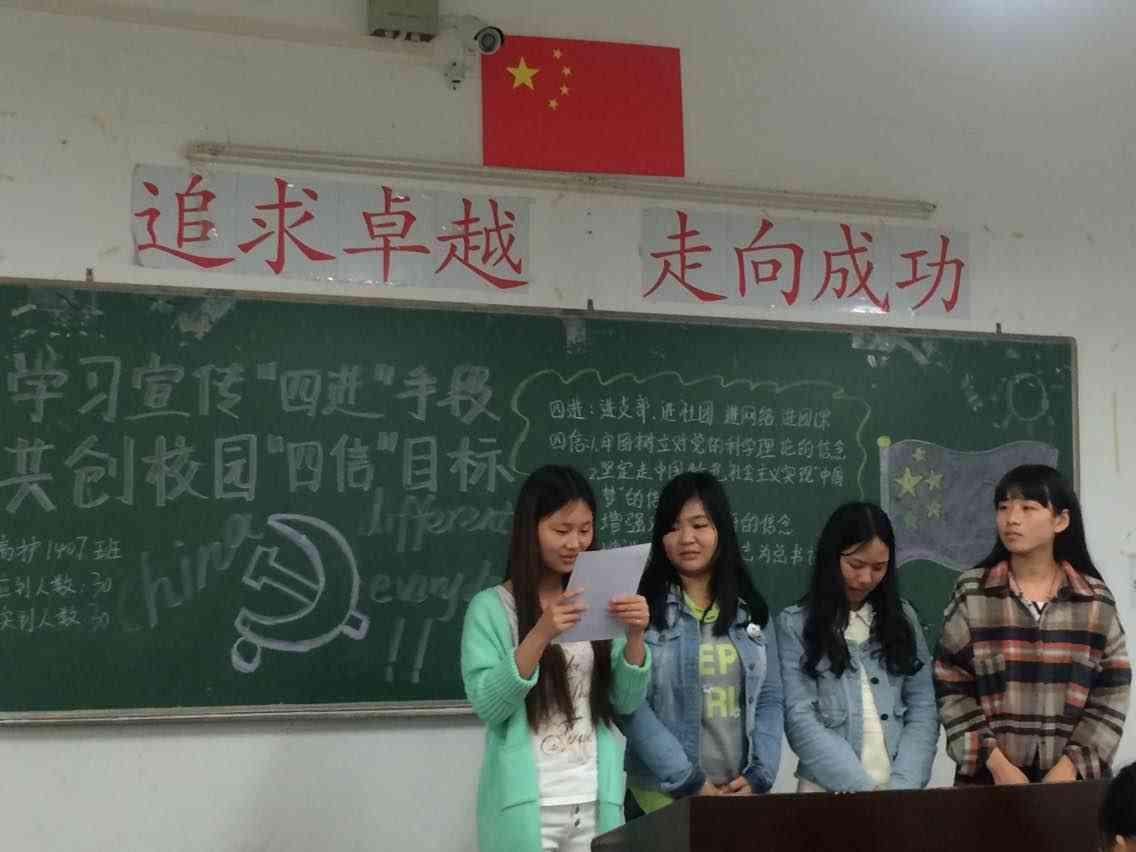 【生科记者站 吴雪姣】为了鼓励大学生更多地进支部,进社团,进网络,进团课,以达到引导帮助广大青年学生和高校团学干部进一步牢固树立对党的科学理论的信仰,坚定走中国特色社会主义道路实现中国梦的信念,增强对党和政府的信任,增加对党中央的信赖。英国上市365官网高护1407班于2015年4月21日组织开展了“四进四信”主题班会。
