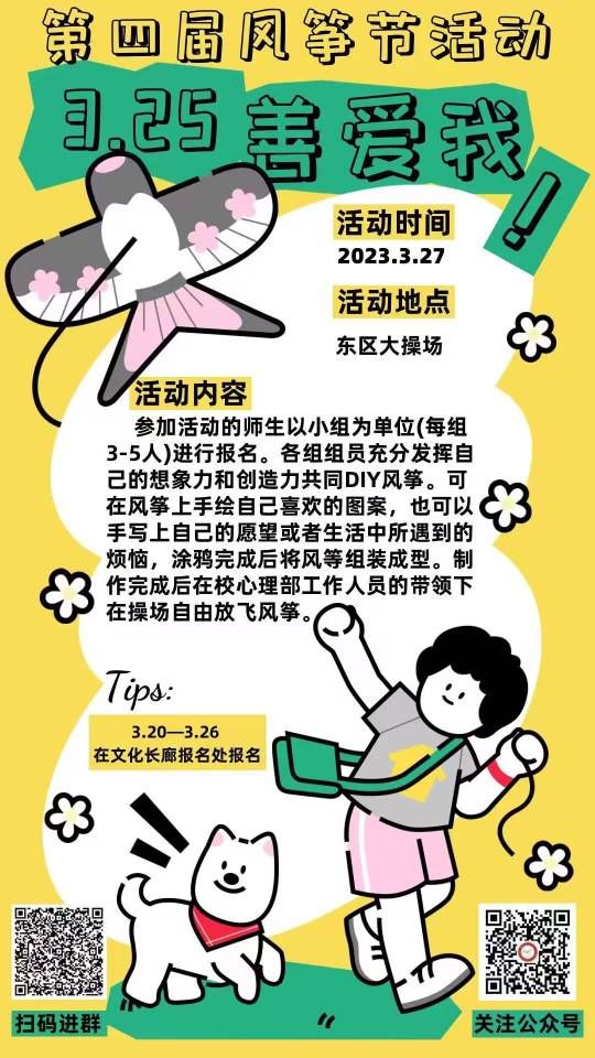 三月,春回大地,草长莺飞。本月,我们将迎来“3.25善爱我”心理健康日。“善爱我”意在倡导大学生善待自我,关爱自我,并以发自内心的爱与和谐来善待、关爱他人及社会,共同构建美丽和谐校园。为在全校范围内宣传“了.25善爱我”理念,共同构建美丽和谐武昌理工,学工处心理健康教育中心拟开展“3.25善爱我”心理健康教育暨第四届风筝节活动,一起查看活动通知吧~