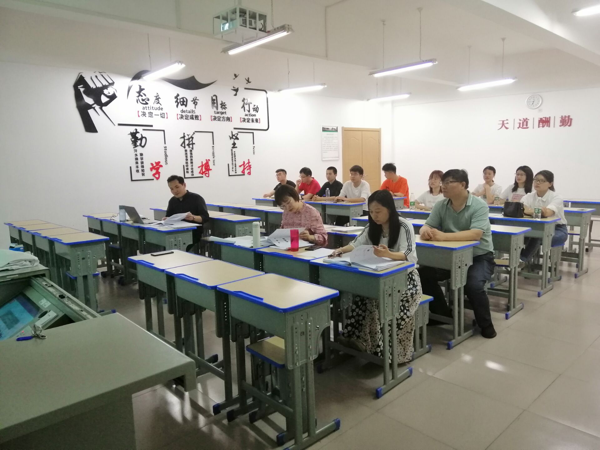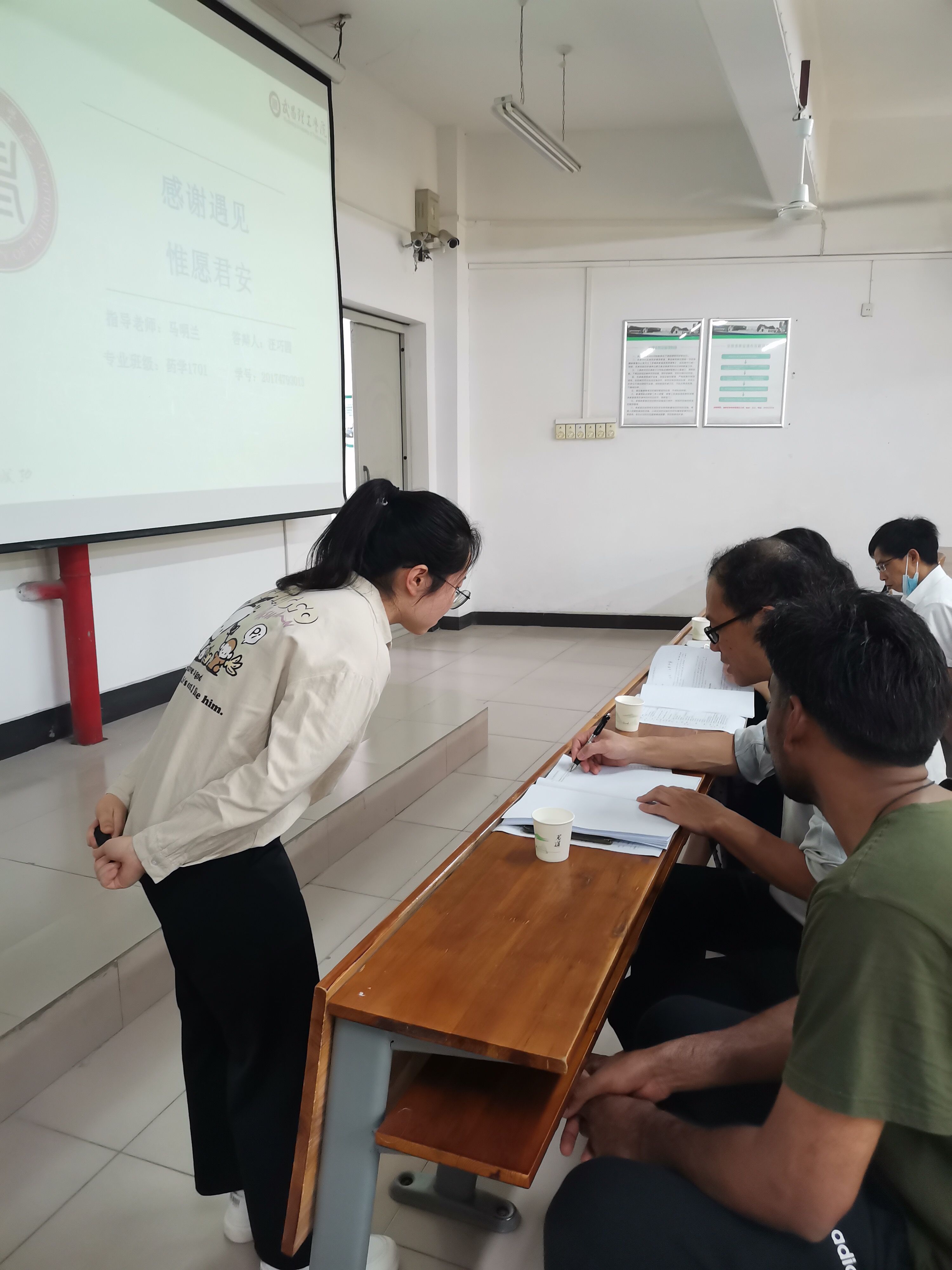毕业生们在参加答辩会之前已经经历过选题、开题、初稿、定稿、论文查重、指导教师审核等重重考验,正是士气高昂,答辩开始后,同学们镇定自若,站上讲台开始自述,通过PPT来介绍自己的论文,并对论文进行自我评价。随后答辩教师针对每位同学的论文提出相关问题,既考察学生对于论文的熟悉程度,也反映出学生对于专业相关知识的理解。对于老师提出的问题,同学们不慌不忙,用自己平时的知识储备和理解有条不紊地回答,虽然仍有一些不足之处,但是在老师们的指正下都及时进行更改,也得到了老师们的充分肯定。