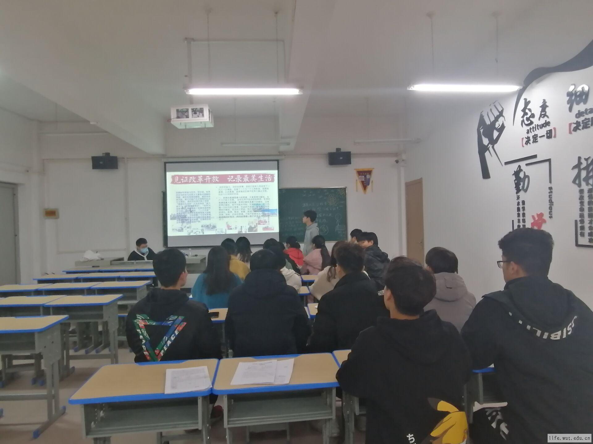 在班会上,环境工程1901班主讲人张顺谊带领同学们回顾了改革开放四十余年来的伟大历程:从安徽省凤阳县的一个小山村开始起源,在邓小平同志的支持下,党的十一届三中全会通过了改革开放政策,解放了人们的思想,推动了中国的经济发展,形成了对外开放格局。当张顺谊问到:改革开放给我们的生活带来哪些影响,陶星回答道:“我国在改革开放以来,社会经济得到飞速发展,科技进步日新月异,我们现在用的手机、电脑等等都有着改革开放的影子。”