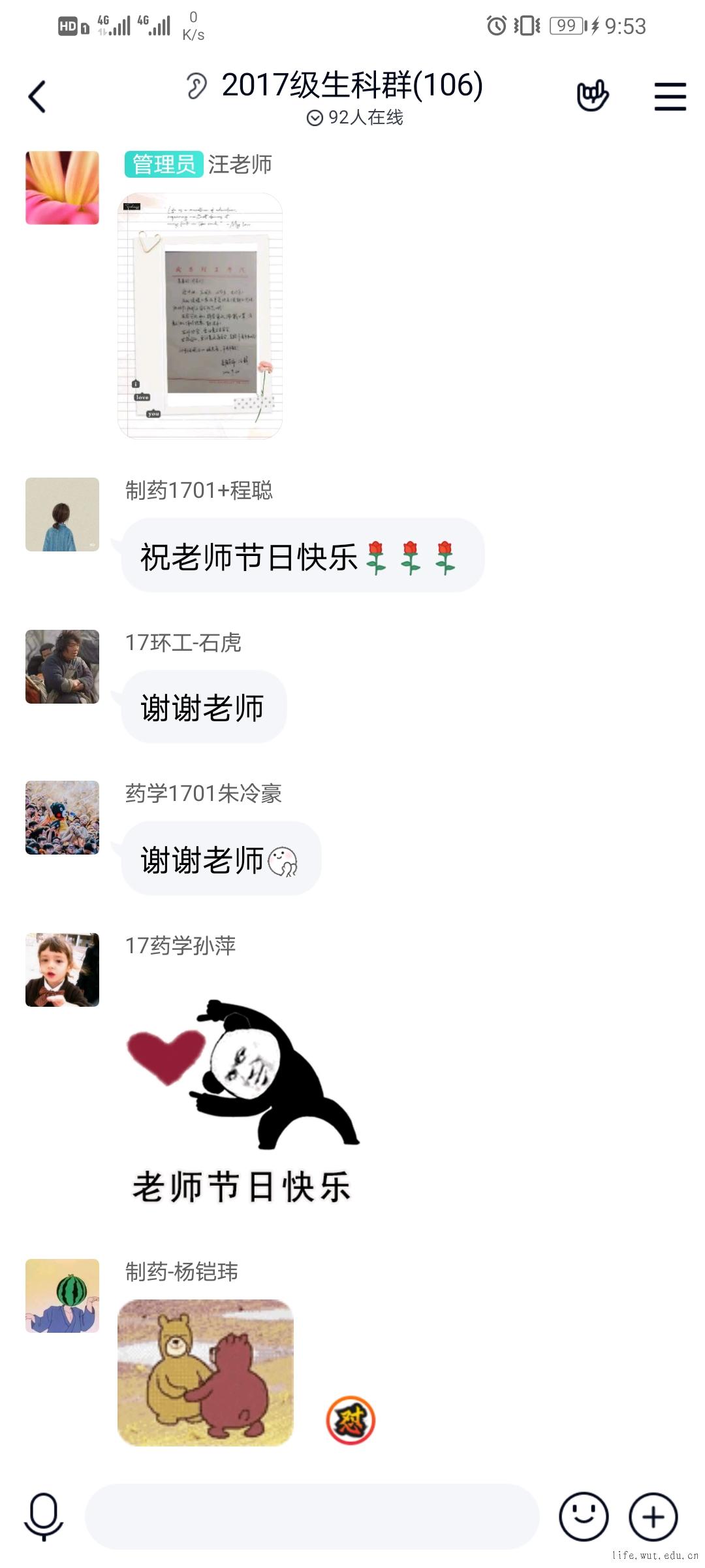 由于汪静老师带毕业班的学生,和学生之间的交流很多,经常关心学生的发展。她在群中转发许多适合学生的招聘信息:武汉迪因生物科技有限公司、药明康德、鼎康生物医药有限公司等,汪静心系学生,默默奉献,用真情搭建建了与学生之间的桥梁。她会留意班级上每一个人的学习状态,用心指导学生在学习中生活中遇到的问题。药学1701汪巧园说道:“我很开心能在汪老师的带领下走完大学的最后一年,汪老师时常关心我们学习和生活,给我们传递正能量!”