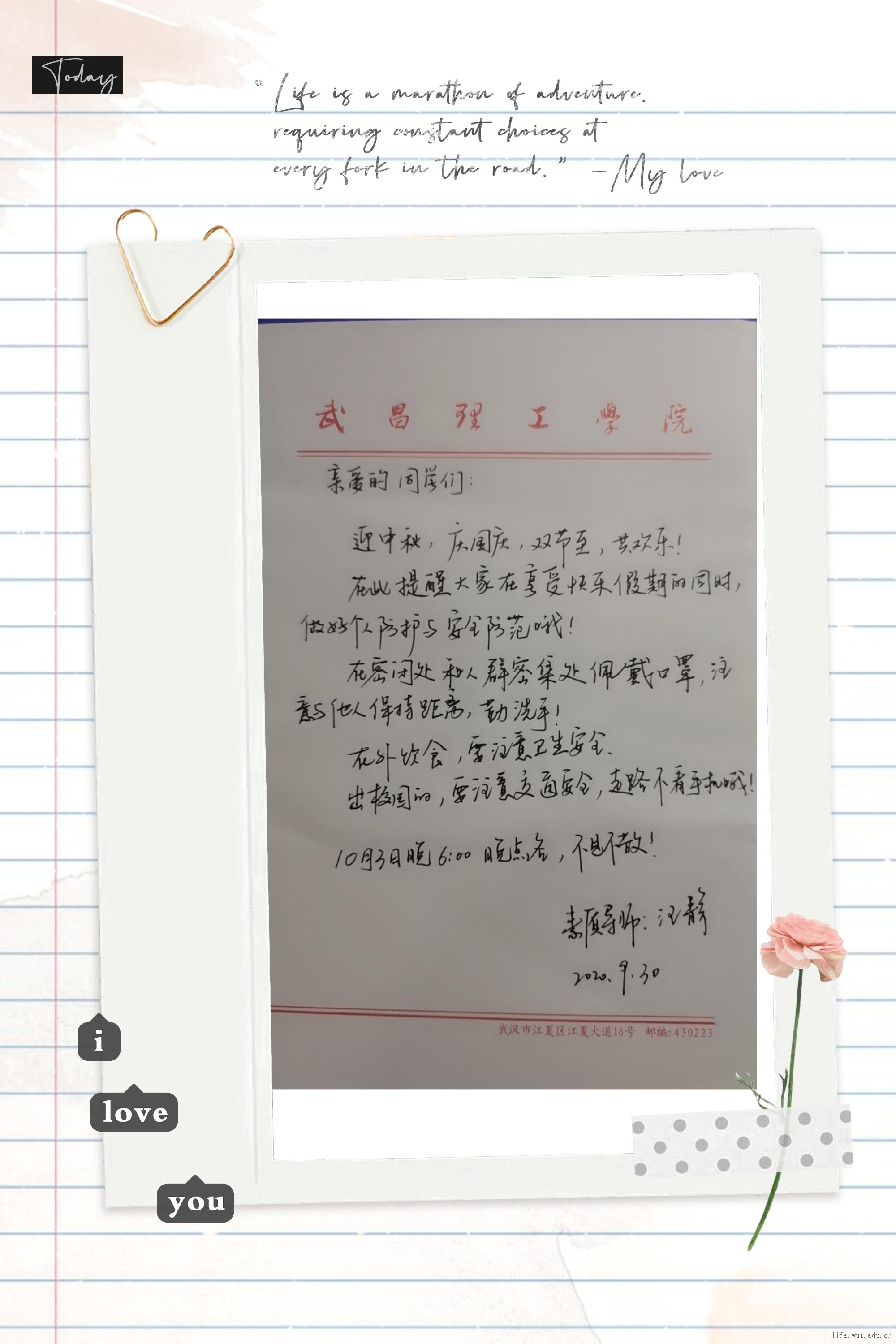 “在简短的假期中,让在校的学生体验到‘双节嘉至’的欢乐气氛,同时也叮嘱学生做好防护,保护个人安全。”汪静老师说道。在武昌理工信纸上:在密闭处和人群密集处,要佩戴口罩,注意与他人保持距离,勤洗手;在校外饮食·······浓浓的关爱之情流露在笔尖,深情珍重。许多同学收到祝福后,纷纷向汪静老师发表祝福和感谢。