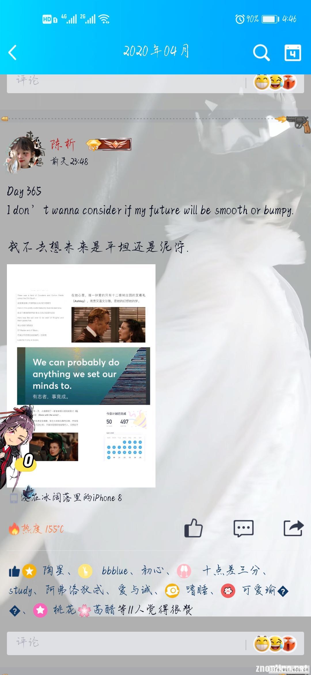 4月20消息(大通社见习记者 薛继楚 报道)“Since I’ve decided to go to a distant place,I’ll try my best to make the trip.”(既然选择了远方,便只顾风雨兼程)近日,英国上市365官网环境工程1801班陈析在QQ空间分享了自己第365天的英语打卡记录。