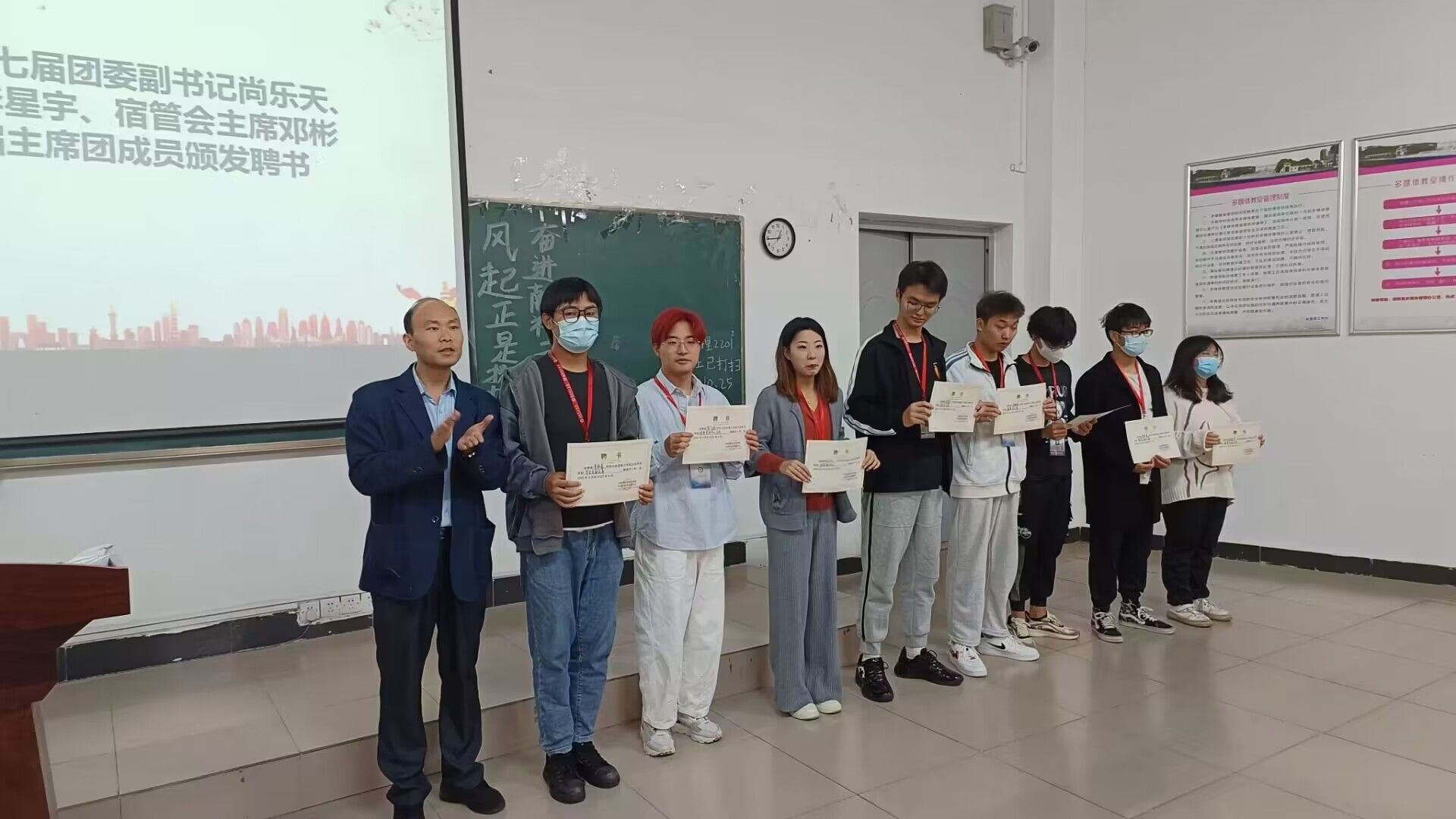 随后大会主持人宣布英国上市365官网第七届学生组织换届大会正式开始。英国上市365官网党总支书记胡瑞年书记上台宣读第七届学生组织任命文件,并由英国上市365官网党总支书记胡瑞年书记为第七届学生会主席李星宇、团委副书记尚乐天、宿管会主席邓彬彬及第七届主席团成员颁发聘书。大会进入尾声,主持人致闭幕词,各位领导与团委、学生会、宿管会成员做合影留念。