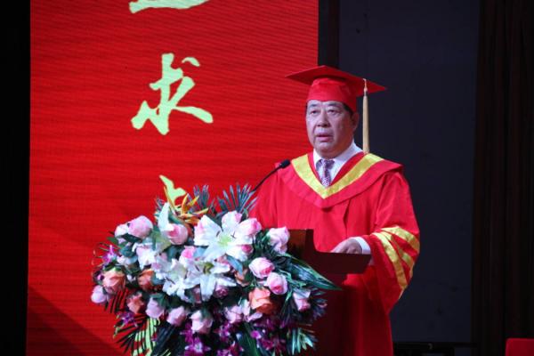 “鲲鹏展翅九万里,长空无崖任搏击。”同学们,今天的毕业典礼是你们在母校求学生涯的最后一课,未来你们的人生画卷是否精彩,画笔掌握在你们手中。希望你们时刻牢记和践行母校“追求卓越,走向成功”的八字校训和“笃志博学,崇实拓新”的大学精神,做一个既能仰望星空又能脚踏实地的人;希望你们凭借自己的聪明才干,始终保持蓬勃朝气、昂扬锐气、创新勇气,像鲲鹏一样展翅高飞,在追求卓越中行稳致远!