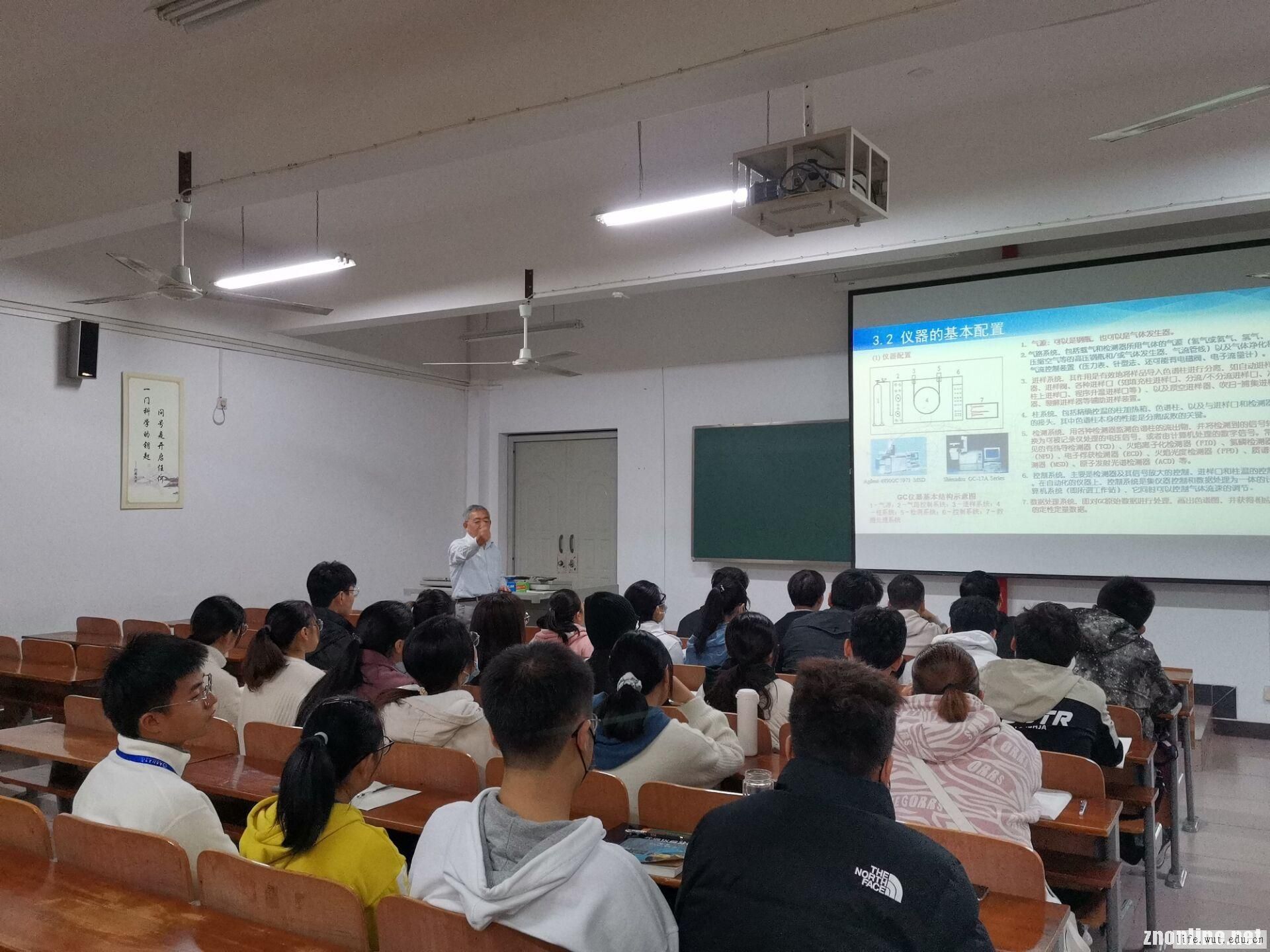 “人要有梦想,确立自己的目标,而这两个认识能让我们确实的为这个目标而努力,也能让自己的生活更加充实……”在课堂之初,刘教授便为同学带来了一番人生见解,激励学生的同时也让学生对这堂课的学习充满了热情于动力。在接下来的课程中,刘虎威教授从“色谱概述”、“色谱理论”、“气相色谱”这三个方面为学生讲述了色谱分析过程、色谱分离机理、色谱基本参数、色谱分离理论、色谱优化理论、色谱定性定量等色谱相关知识。刘教授在授课过程中表现出高度的专业性,带领学生在环环相扣的知识体系中探索色谱的奥秘,环境工程1901班的学生也保持着高度的集中,跟随刘教授授课进度的同时也积极回应他提出的问题。