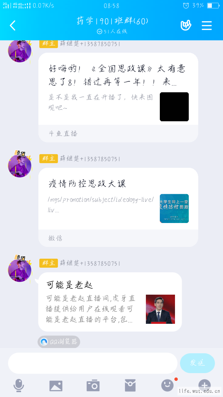 “在此次课程中,教授为我们讲述历史,讲述国情,讲述责任担当。父辈终将老去,我们应当听从党的指挥,历练本领,肩负起民族复兴的历史使命,担当起自己的青春责任。”该院党支部预备党员汪巧园观看完思政课后感叹道。由于全国大学生参与学习,人数过多,部分同学一开始便遇到了直播延迟等问题,但大家热情不减,许多同学在思政大课结束后,都颇受收获。生物工程1701班班长陈永乐说:“这次思政大课的教授们用心用情、有理有据,当下我们青年学生要做好防疫工作,增强忧患意识,担当起青春责任,不负韶华。”