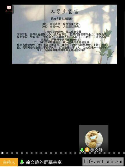在这次网络主题教育活动中,首先播放由何炅配音的《嘿!你在干嘛?》视频,告诉大家社会各个阶层的人民都在为武汉的春天做出伟大的贡献,让学生们心中充满信心。接着,在面对“青年当下应该做什么”的问题下,大家纷纷表示要牢记总书记嘱托,把学习习近平总书记的重要回信精神贯穿在学习、实践以及日常生活的各个环节,取得优异成绩,不辜负总书记的期盼,为祖国繁荣昌盛作出应有贡献。最后,大家畅所欲言共同探讨习近平总书记的“回信精神”,药学1901班夏雪莹感慨道:“青海省是最晚被感染,也是第一个‘痊愈’的省份。我在故乡看见医护人员的无私奉献,看见中国共产党党员的热心帮助。作为新青年要把握青春奋斗的使命,坚定青春理想。”