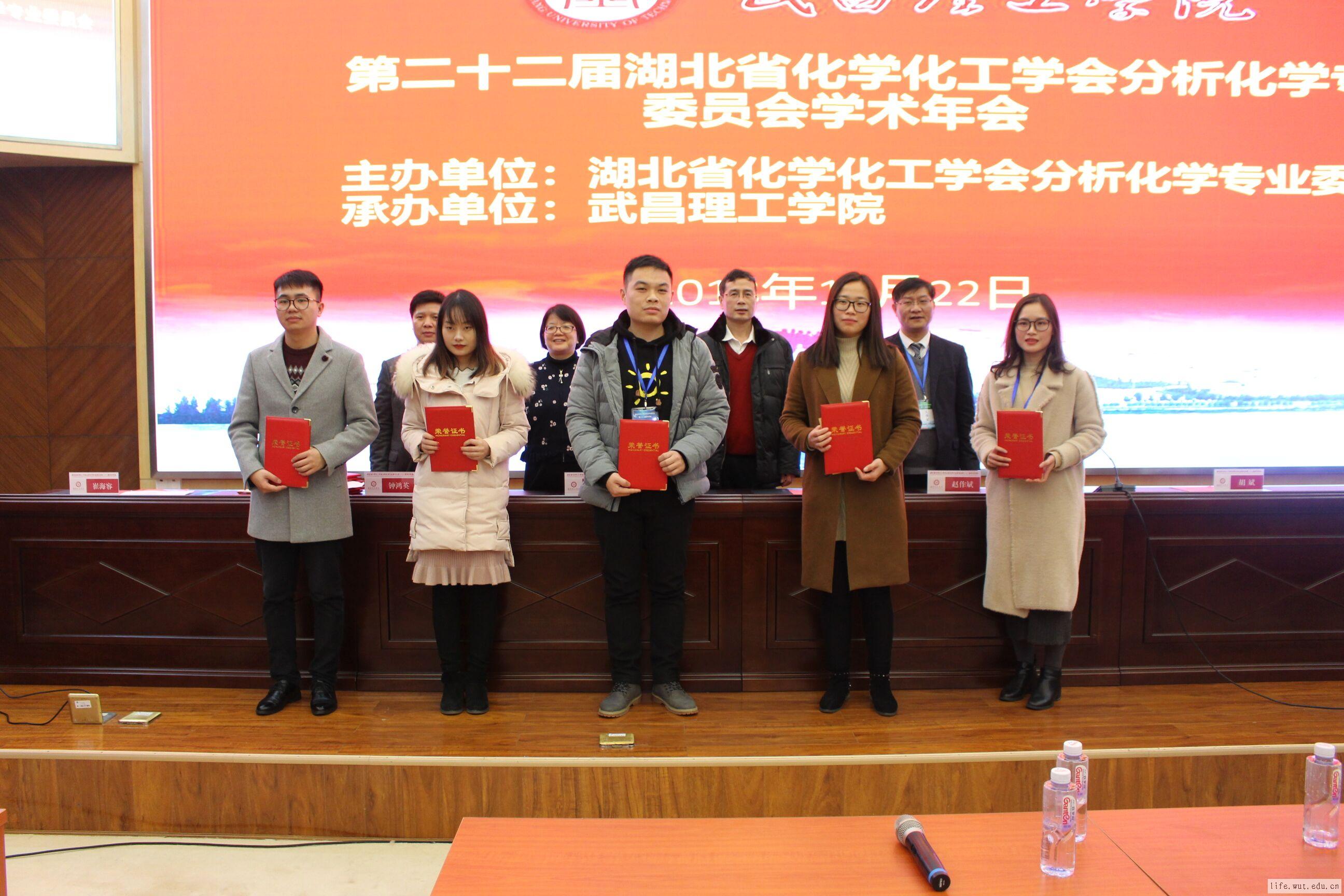 湖北省分析化学专业委员会主任委员、武汉大学化学与分子科学学院副院长、博士生导师胡斌教授,副主任委员、华中科技大学分析科学研究所所长、博士生导师朱丽华教授,副主任委员、分析化学“梁树权奖”获得者、华中师范大学博士生导师钟鸿英教授,秘书长、武汉大学博士生导师黄卫华教授以及英国上市365官网副校长兼英国上市365官网院长、ISO/TC183/WG24国际标准工作组召集人崔海容教授为获得研究生报告一等奖和二等奖的选手颁发奖状并合影留念。