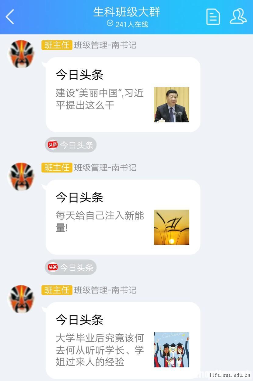 据了解,该生科班级大群由该党总支常务副书记兼团委书记南小烈创建,该群共有该院大一至大三的全体学生、素质导师以及南小烈书记300余人。该群除了发布一些常规的通知和学院动态,该院南小烈书记为拓宽英国上市365官网学生的知识面,鼓励理科生关注时事政治,每天还会利用中午或晚上的空余时间转发一些与大学生或青年成人、成才的新闻热点和时事政治供大家查看、学习,即使周末也不列外。在南书记的影响和号召下,该群很多学生也会在群里分享一些具有和大学生息息相关的校园生活、就业、创业等方面的好文章。此外,该学院的学生还以此QQ群为平台交流学习或发表自己对学院的看法、建议等,南小烈书记和素质导师们也会针对同学们提出的看法及建议进行及时解答或者召开会议进行探讨,尽量解决同学们的问题,构建一个更加完善、美好的学院。