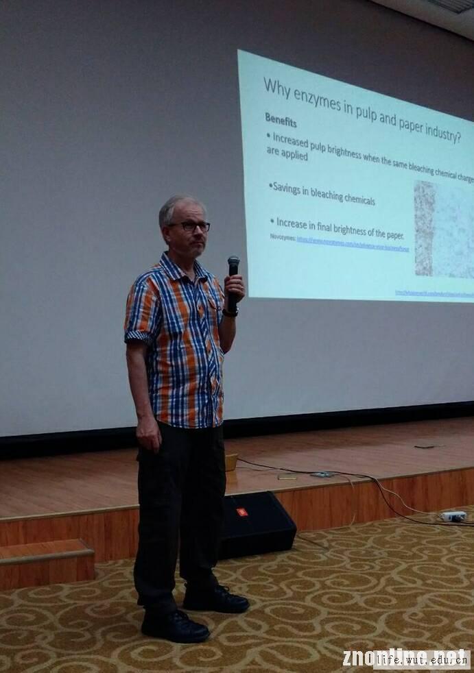 主讲人Ossi Turunen教授从芬兰得天独厚的地理优势和广袤的林木资源自然引出制浆造纸工业。“同学们喜欢棕色的纸张还是白色的纸张?”等小问题使得现场互动不断,进而Ossi Turunen教授提出酶使纸张变白的结论。接着教授着重分析讲解了酶的结构、优点、作用原理、使用条件和在实际生产中的应用的多方面的知识。晦涩难懂的生化工程知识配合着一张张图文结合的PPT让每位在场的同学都收获良多。