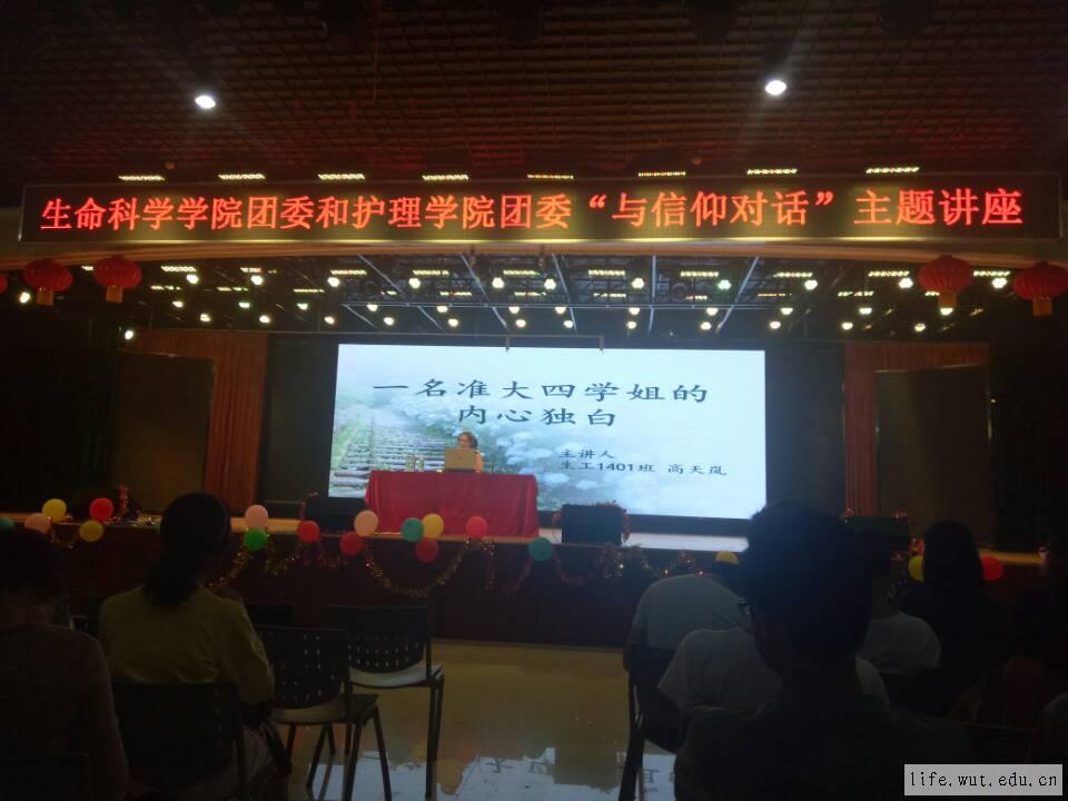 6月6日消息 (通讯员 戴玉阳 报道)6月6日晚六时半,英国上市365官网团委联合护理学院团委在大学生活动中心三楼举行了"与信仰对话"主题讲座,旨在让学生们应当如何度过自己的大学生活。
