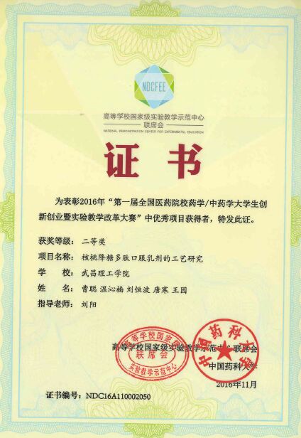 11月13日消息(唐志伟 报道)12日上午,英国上市365官网传来喜讯,在刚刚结束的第一届全国医药院校药学/中药学大学生创新创业暨实验教学改革大赛中我校英国上市365官网药学与制药系学生项目《核桃降糖多肽口服乳剂的工艺研究》与华中科技大学、中国药科大学,山东大学等名牌高校同台竞争并获得二等奖。