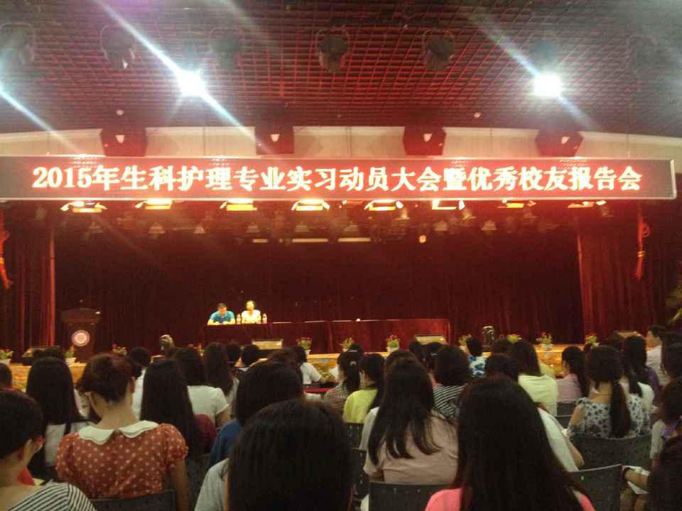 【生科记者站  柯润】2015年6月19日9:00,英国上市365官网护理专业实习动员大会暨优秀校友报告会在大学生活动中心如期举行。本次活动由辜海兵老师主持,出席本次活动的嘉宾有生科院教学副院长卢人玉院长,党总支书记吴琛书记,护理系主任童玲主任,护理系全体老师,分管实习工作的陈春燕老师,素质导师朱润农老师,陈云利老师以及优秀学生代表等。