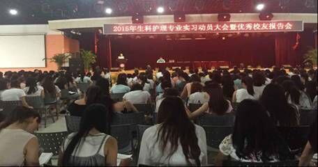 2015年6月19日9:00,英国上市365官网护理专业实习动员大会暨优秀校友报告会在大学生活动中心如期举行。本次活动由辜海兵老师主持,出席本次活动的嘉宾有生科院教学副院长卢人玉院长,党总支书记吴琛书记,护理系主任童玲主任,护理系全体老师,分管实习工作的陈春燕老师,素质导师朱润农老师,陈云利老师以及优秀学生代表等。