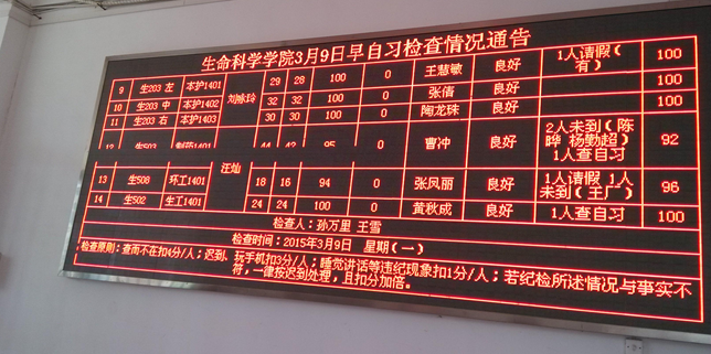 (何松玲)为加强大一学生早晚自习学习成效,本周实行早晚自习实名制记录,迟到,早退,缺勤等违纪行为同学的名字将会出现在该学院门口的电子显示屏上。