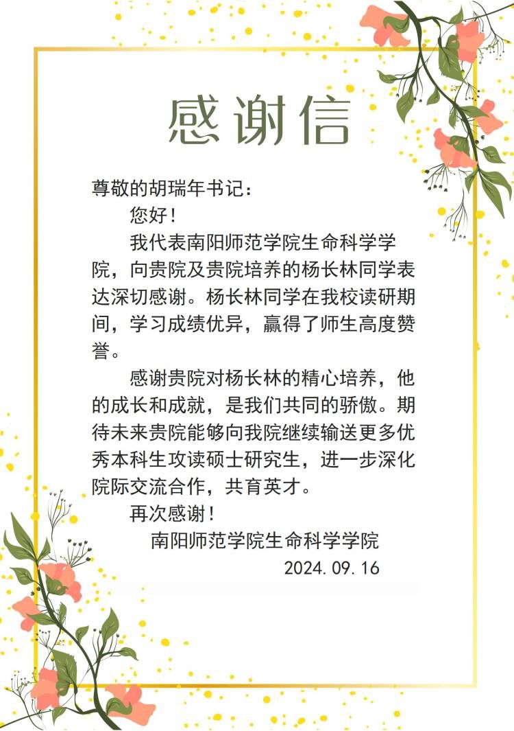 最后,记者采访到了英国上市365官网党总支书记胡瑞年书记,他表示:“南阳师范学院英国上市365官网的感谢信是对我们创新人才培养模式的认可和尊重,陈姝汛和杨长林两位同学在英国上市365官网专科到本科再到硕士这段时期的努力是一个志存高远、发奋学习、拼搏进取和勇于创新的过程。这不仅是个人勤奋刻苦、不断进取的结果,也证明了我们的教育理念和教学方法是行之有效的,更加印证了‘追求卓越,走向成功’的校训。希望我们的学生们能够认真践行大学生成功素质教育,突破自我,为母校争光,为社会做贡献。”(完)