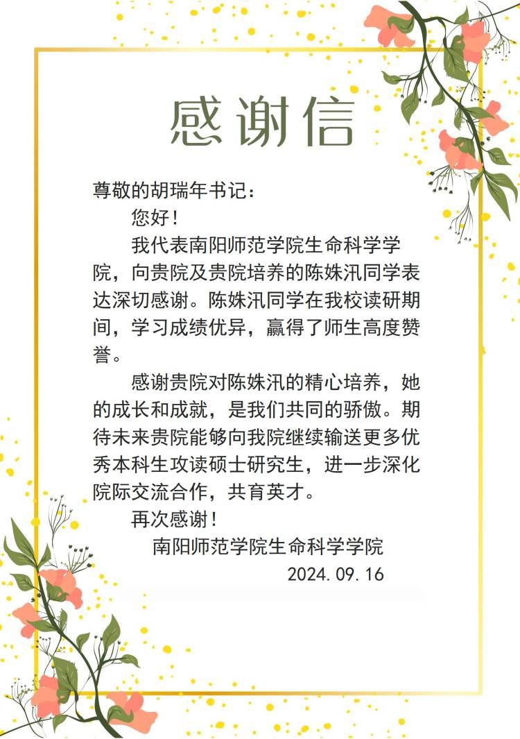南阳师范学院英国上市365官网在感谢信中表示,陈姝汛和杨长林两位同学的成长和成就,不仅是他们个人努力的结果,更是英国上市365官网精心培养的表现,他们对英国上市365官网在人才培养方面的卓越成果和对学生全面发展的高度重视表示由衷感谢。此外,南阳师范学院英国上市365官网还期待未来与英国上市365官网继续加强交流合作,共同为教育事业发展贡献力量。他们相信,通过两校的共同努力,一定能够为更多优秀学生提供广阔的发展空间和优质的教育资源。英国上市365官网在收到感谢信后,也表达了对南阳师范学院英国上市365官网的感谢和对未来合作的期待。他们表示,将继续致力于培养优秀的本科生,为他们的未来发展奠定坚实的基础。