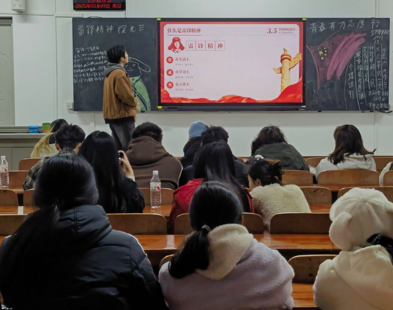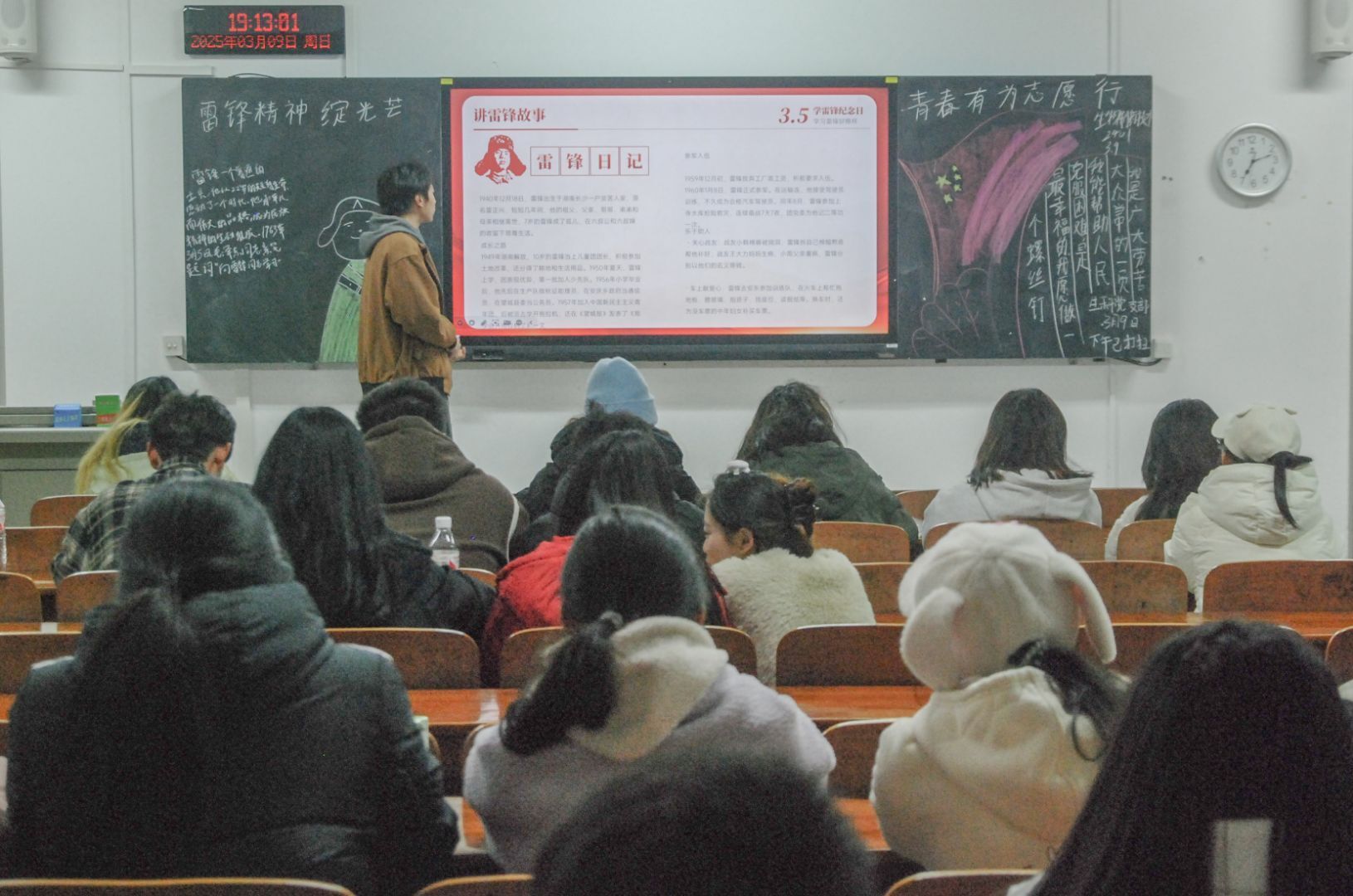 班会伊始,主持人以一段生动的视频引入主题,带领同学们回顾了雷锋同志的生平事迹。随后,主持人详细介绍了雷锋精神的内涵,强调了其在新时代的重要意义。雷锋精神不仅仅是过去的历史记忆,更是当代青年学生应当传承和践行的宝贵精神财富。