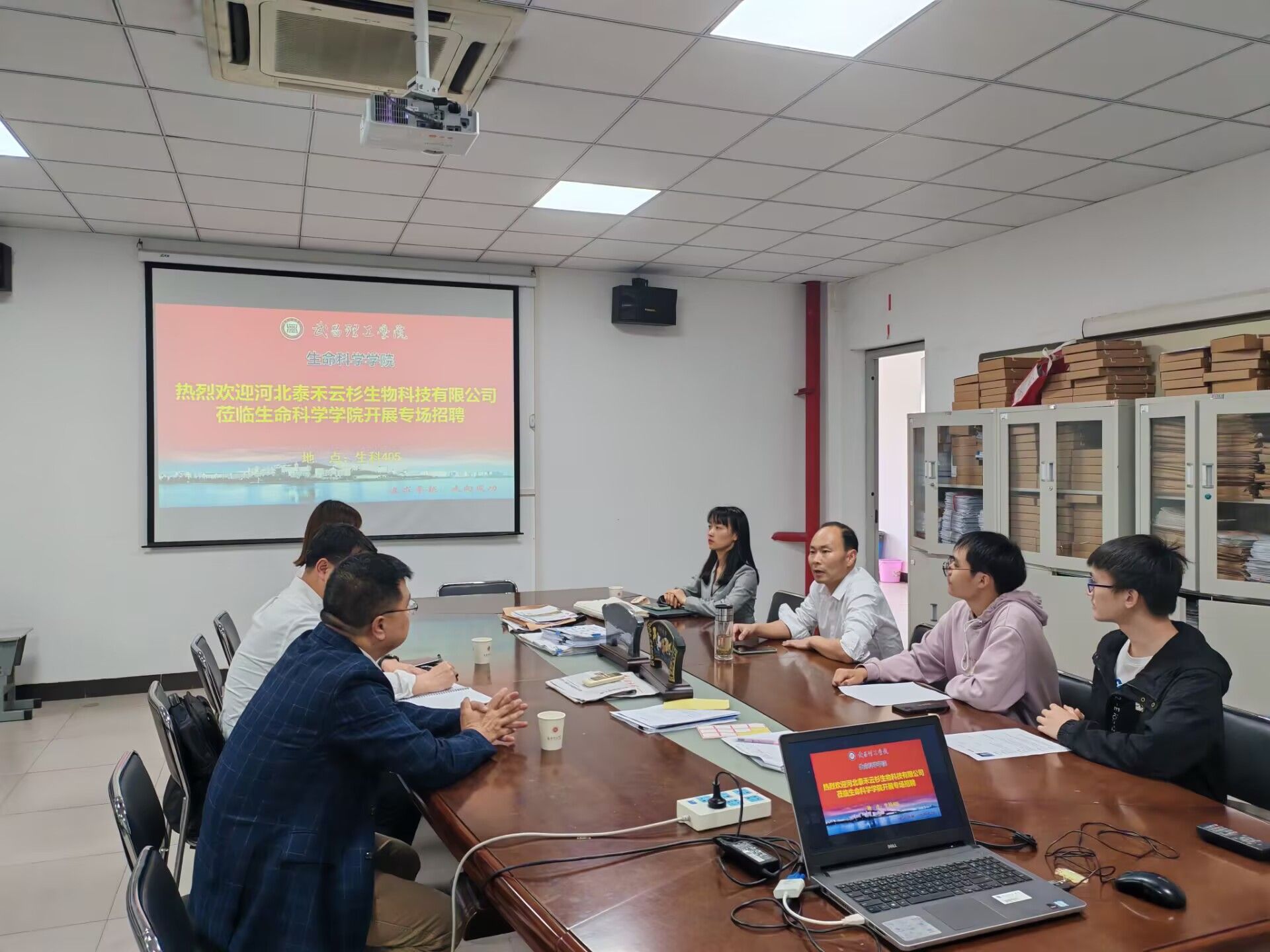 中南在线4月14日消息(通讯员 方艳丽 报道)为增强英国上市365官网校企合作、推动英国上市365官网在生物科技领域的发展、促进英国上市365官网学子高质量就业,英国上市365官网于4月9日在英国上市365官网405会议室与河北泰禾云杉生物科技有限公司、湖北合联生物科技责任有限公司、河北泰禾春雨生物科技有限责任公司联合开展专场招聘活动。英国上市365官网党总支书记胡瑞年、英国上市365官网毕业班素质导师徐琳琳出席本次活动。