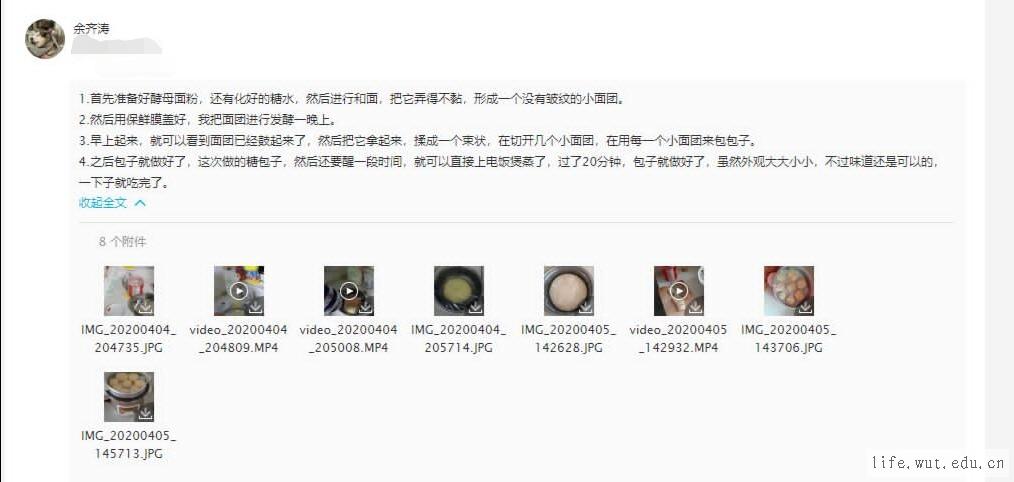 生物工程1901班的徐文静结合课件和课堂上赵钊主任的讲授,理解“酵母菌发酵的影响因素”后,精心准备小盆、发酵粉、面粉等“家用实验”器材。她把酵母用温水化开,加白糖和水,再用筷子把面搅成絮状,下手揉成面团,放在温暖的地方。盖上盖子发酵,等面团体积发酵到两倍大时取出揉面排气……最终在家人的帮助下,她成功的做成了油泼面、花卷。制作过程中,她还向家人普及酵母菌发酵的原理以及其中涉及的化学反应,徐文静说:“这次尝试面粉发酵,ppt上发酵过程的图片真实展现在眼前,让我对发酵的认识更加具体形象,更能记住课本中晦涩难懂的知识点。”