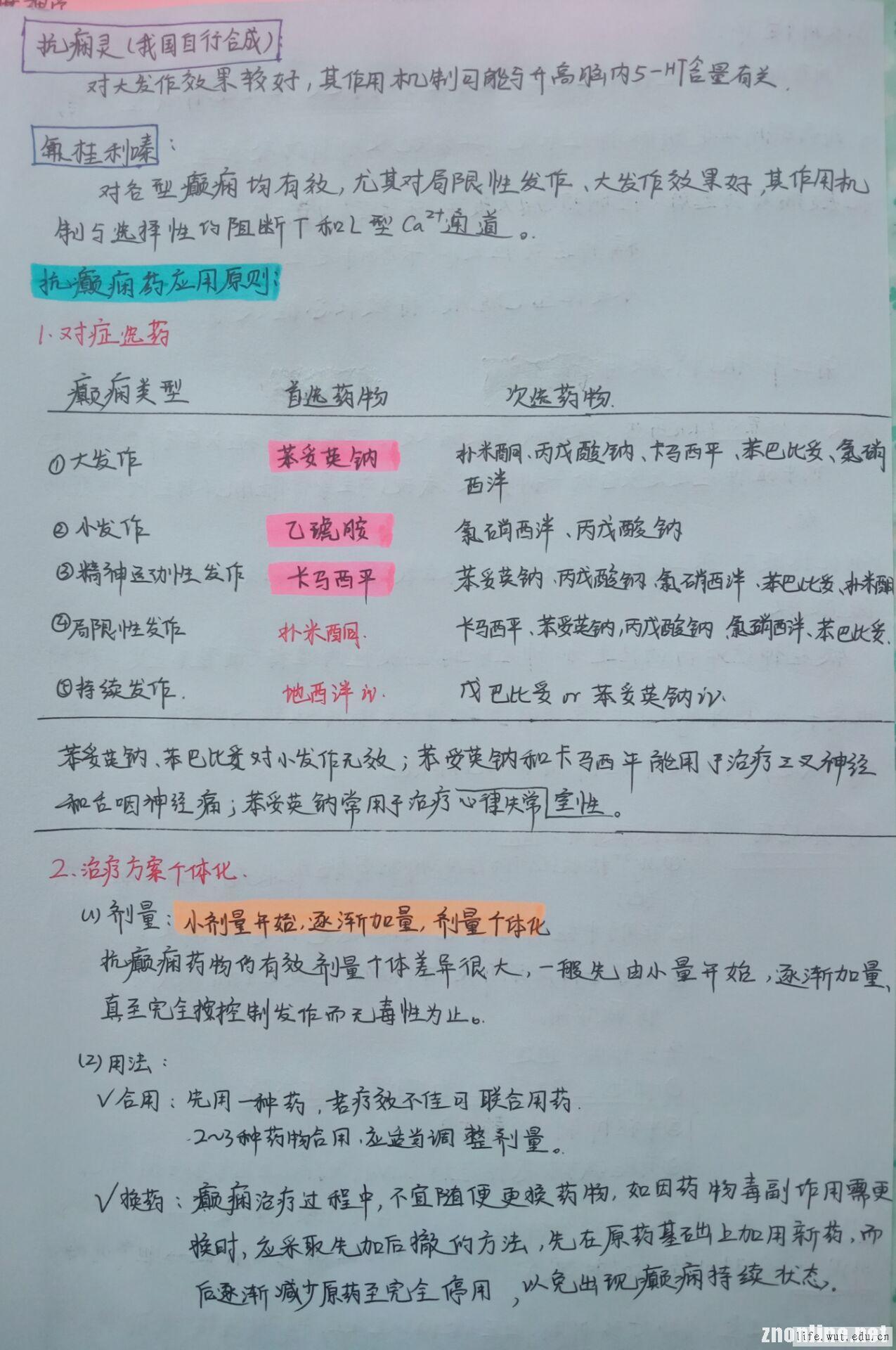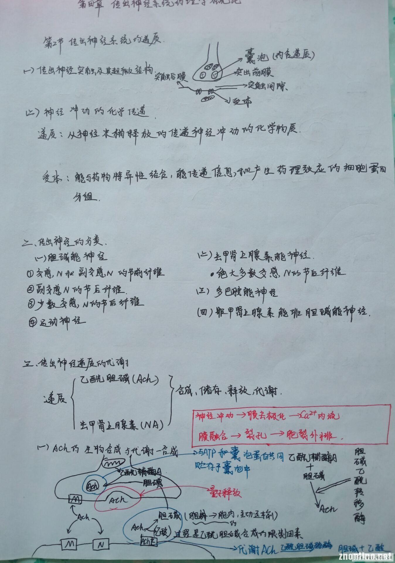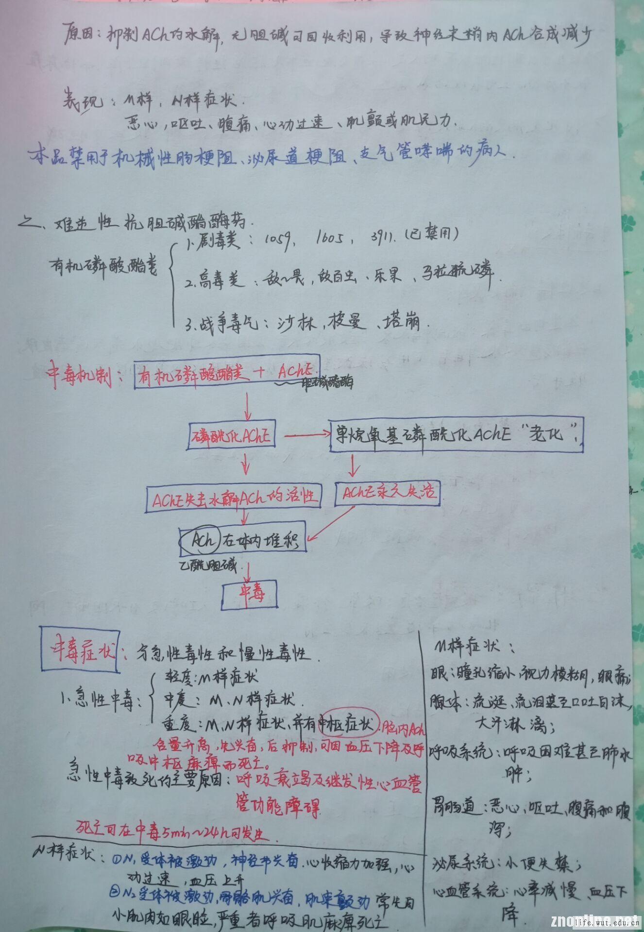 笔记亮点:图文并茂,亲手画出传出神经突触的超微结构,使笔记更直观、易懂、生动;画出Ach微生物合成与代谢过程图、有机磷酸酯类中毒机制过程图,癫痫类型对症药表格,让笔记更好的展现各个部分的需求,思路清晰;荧光笔划重点,使用大小标题,大小写数字和符号,使笔记更加有层次感,内容清晰。
