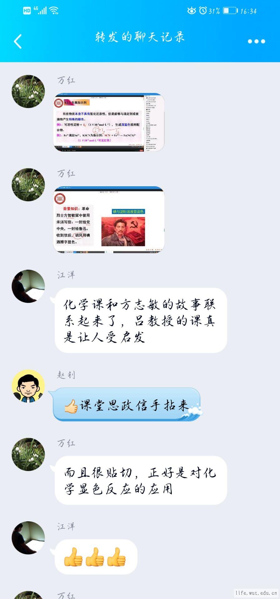“有些物质本身不具有氧化还原性,但能够与滴定剂或被滴物产生特殊的颜色。”当谈到氧化还原指示剂时,吕教授谈到了一种特殊的指示剂:专属指示剂,并说道:“革命烈士方志敏在狱中用米汤写信给党中央和鲁迅,收到信的胡风用碘酒使字显色,这就是一种专属指示剂。”吕教授在课堂上旁征博引,不止历史知识,自己的实际经历、国内外各类著名事件、各类参考资料等等,吕教授都信手拈来,在课堂讲授之中灵活运用,复杂的分析化学在他的讲授之下变得贴近生活,平易近人。听过吕教授讲课的学生们纷纷表示:“吕教授的化学课贴近生活,而且吕教授经常贴合我们的专业,谈论化学在我们专业之中的应用,这使得我们对于自己得专业更加了解。”