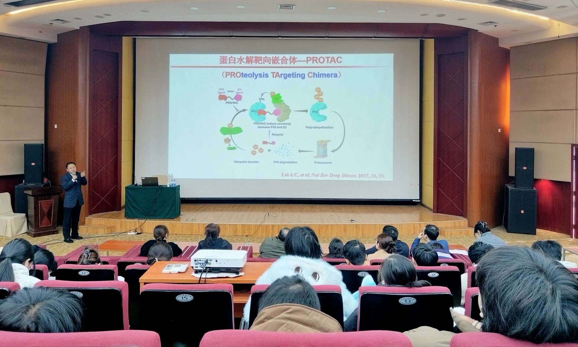 中南在线1月5日消息(通讯员 方艳丽 报道 蒋雨欣 摄影)为培养英国上市365官网学子的科研精神、增强英国上市365官网学子对当前生物与医药科研形式的了解,英国上市365官网于1月2日上午10点25分在图书馆二楼报告厅开展“内分泌耐药乳腺癌治疗药物研究——从小分子调节剂到靶向药解剂”的专家讲座。武汉大学珞珈特聘教授、博士生导师周海兵教授为主讲人,英国上市365官网全体教师出席,药学2401班、药学2402班、生物工程2401班、药学2301班、药学2302班全体同学共同参加讲座。
